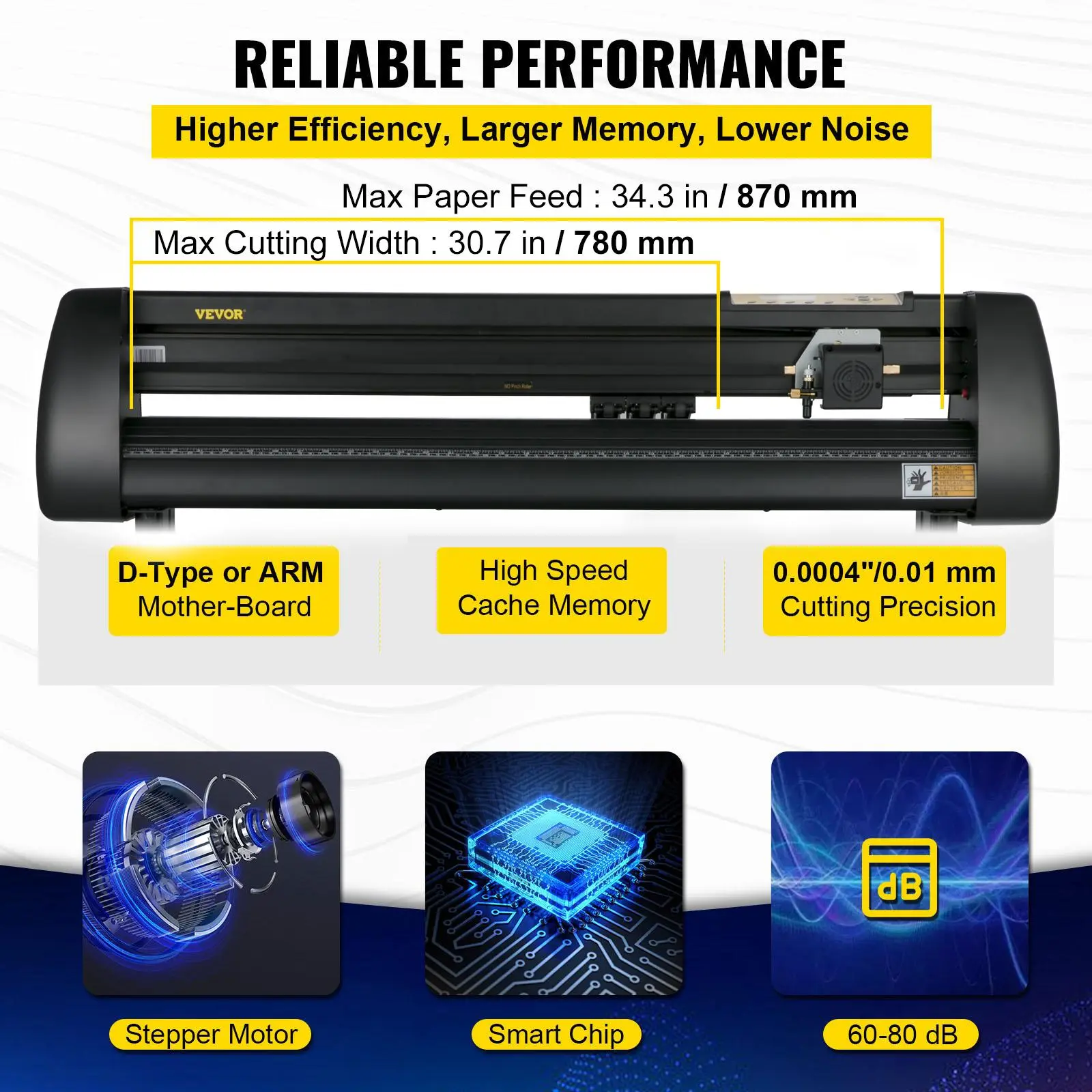 • Cutting Capacity: 34-inch vinyl cutter with maximum paper feed of 34.3" / 870 mm, maximum cutting width of 30.7" / 780 mm, cutting precision of +/- 0.0004" / 0.01 mm, and paper feed precision of 118" / 3 m.