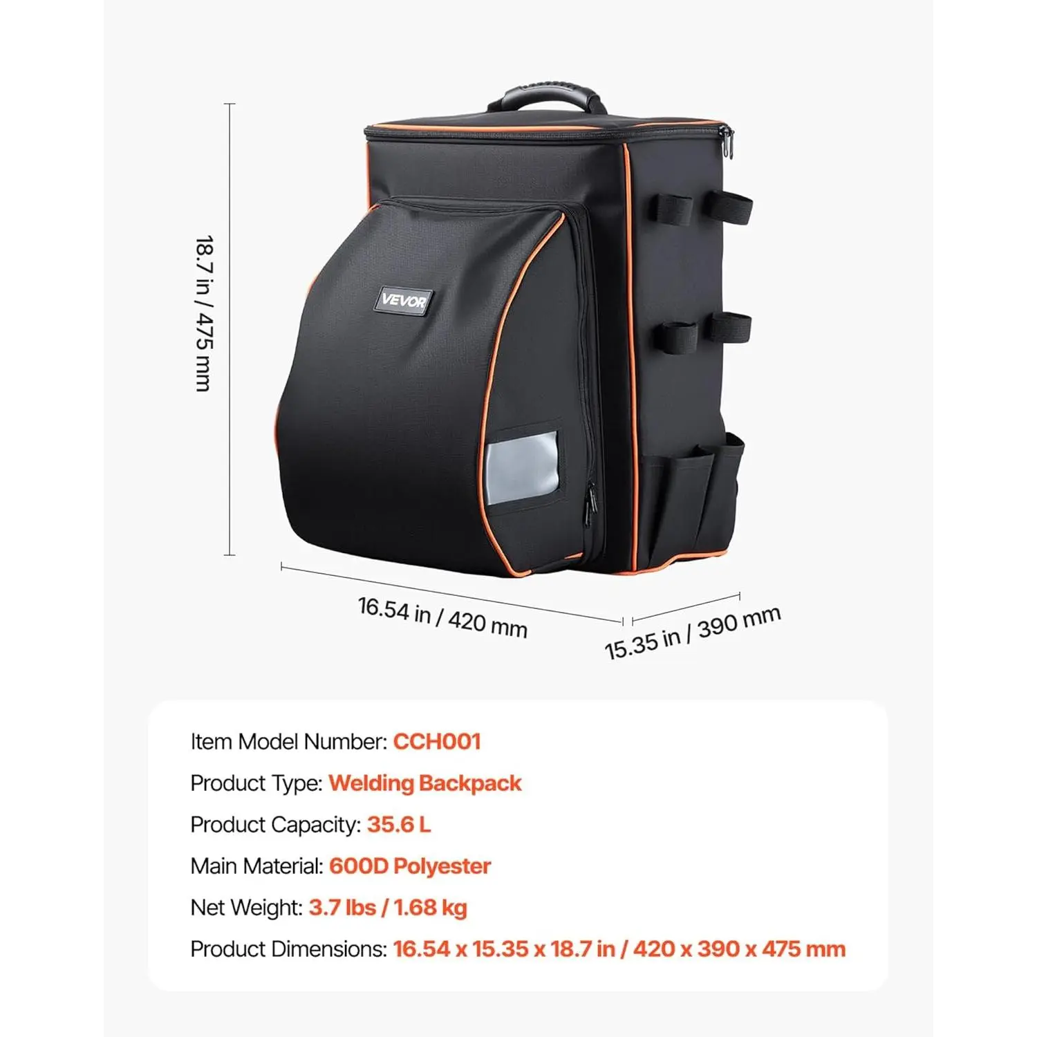 Organize and carry with ease!The VEVOR welding backpack offers a generous 35.6L capacity, perfect for storing your welding equipment, welding helmet, welding jacket, welding gloves, and more.Crafted from 600D polyester, it is durable and wear-resistant to withstand various work environments.