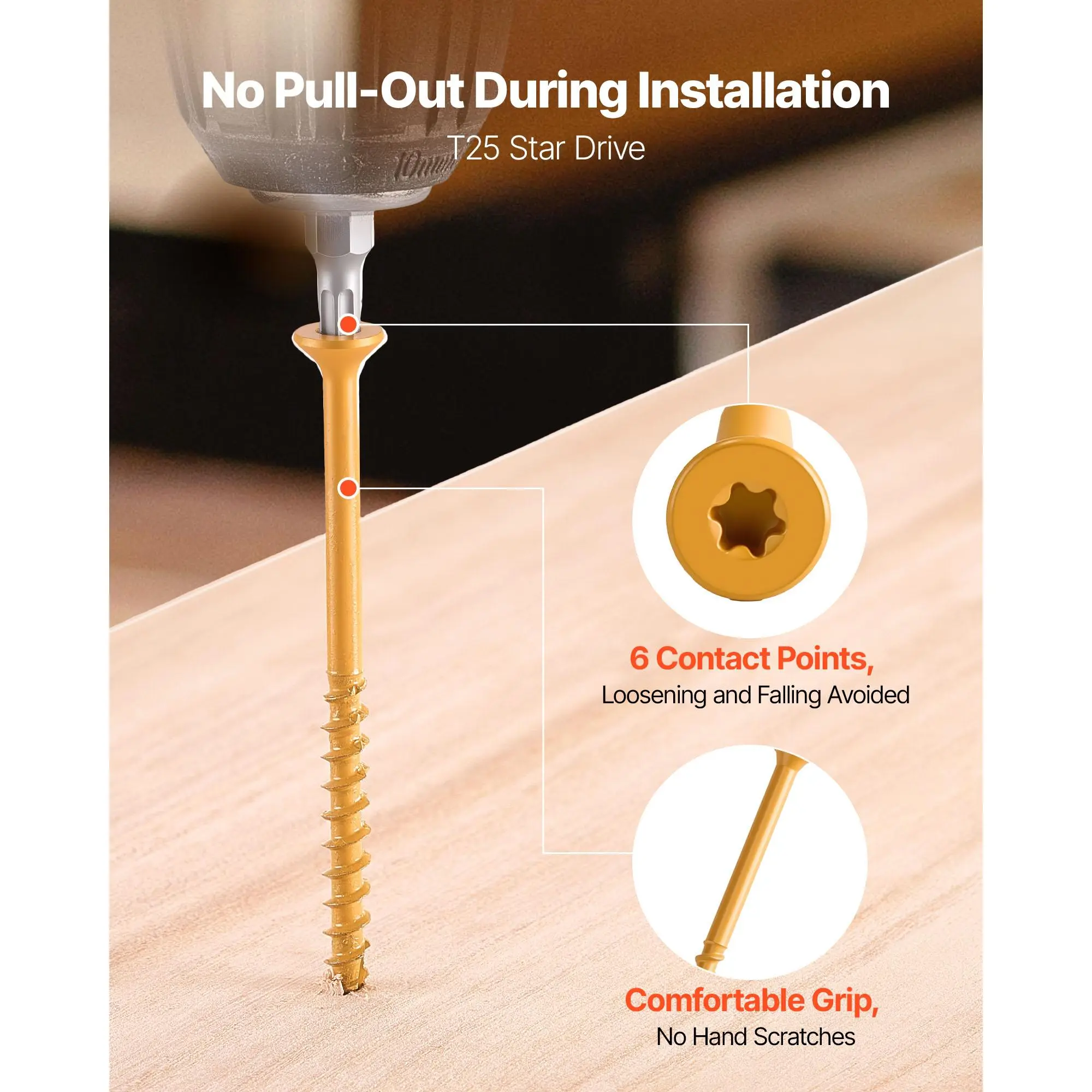 • Star-Shape Hex Drive: The T-25 star drive features 6 contact points to avoid slipping or loosening of the screw slot. It reduces driving torque and allows for fast insertion into wood structures, even when operating with one hand