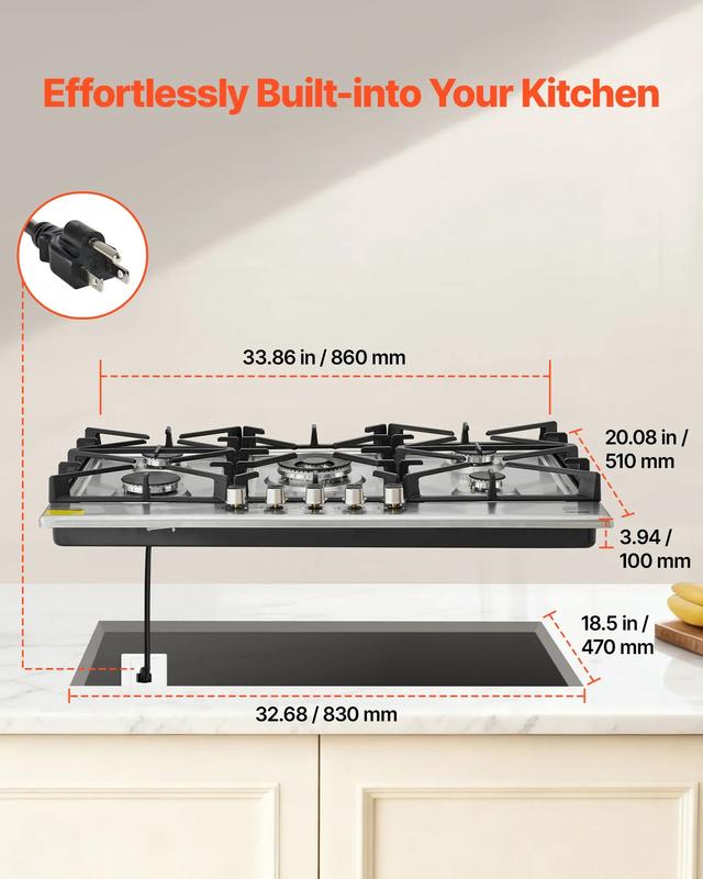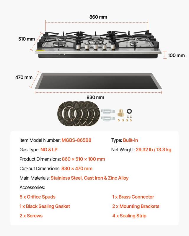 ·Thoughtful Daily Design: This VEVOR gas stove top uses sealed burners to limit spill entry, and its stainless panel wipes clean with ease. Removable cast-iron grates help reduce buildup, while heavy cast supports and zinc-alloy knobs offer steady hold and a smooth, heat-ready turn