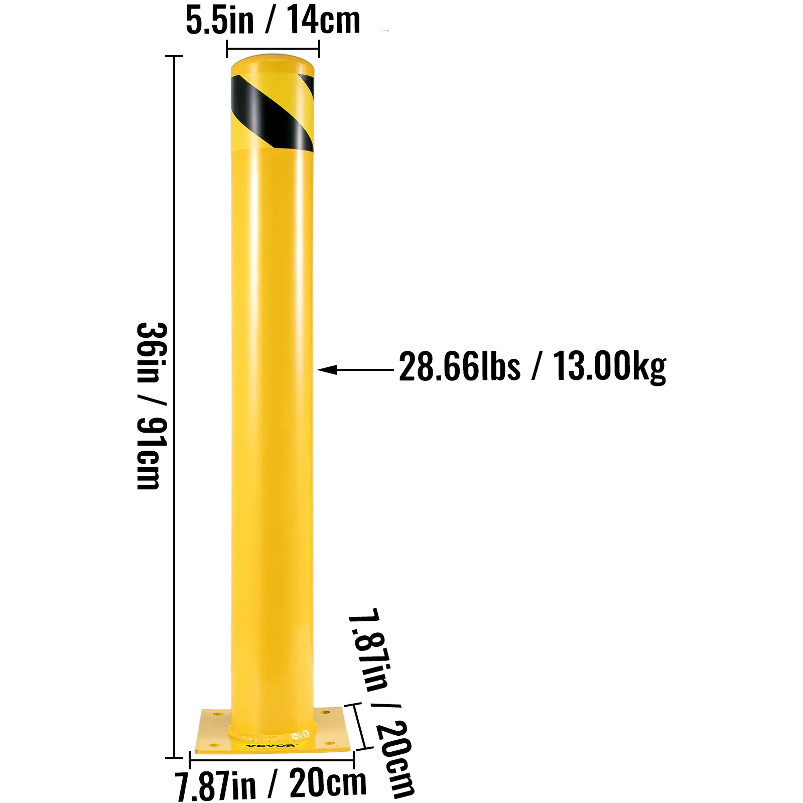 • Welded Steel Construction: The welded and integral structure enables this safety bollard to withstand impact, releasing you from the harm caused by vehicle collisions, etc. This 36" height safety bollard, with the pipe diameter of 5.5" and pipe thickness of 0.12", is made of Q235 steel, ensuring high hardness, great strength, and durability.