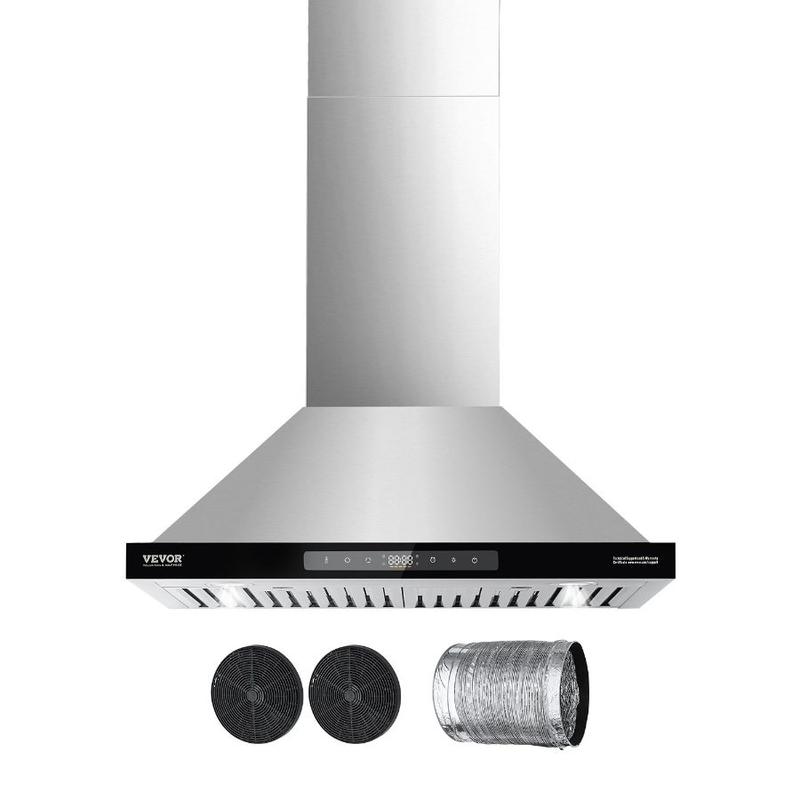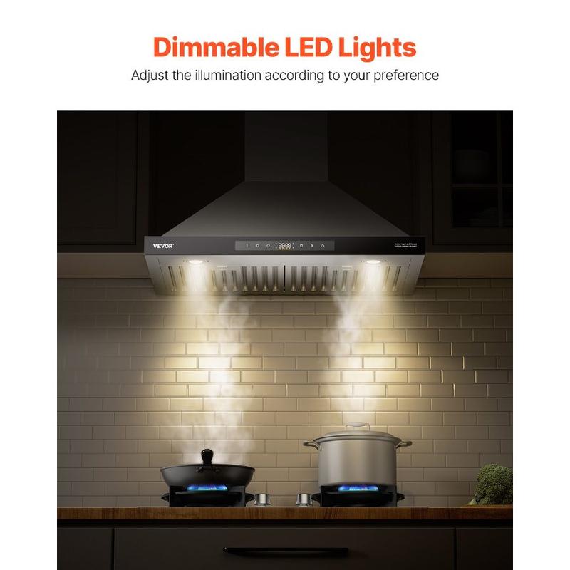 VEVOR Wall Mount Range Hood, 36 inch Chimney - Style Ceiling Mount Vent, 800 CFM Stainless Steel Kitchen Stove Hood with Gesture Touch Control, LED Light, Baffle Filters, Ducted/Ductless ConvertibleVEVOR Wall Mount Range Hood, 30 inch Chimney-Style Ceiling Mount Vent, 800 CFM Stainless Steel Kitchen Stove Hood with Gesture & Touch Control, LED Light, Baffle Filters, Ducted/Ductless Convertible 800 CFM Suction Power Easy-to-Clean Structure Advanced Gesture & Touch