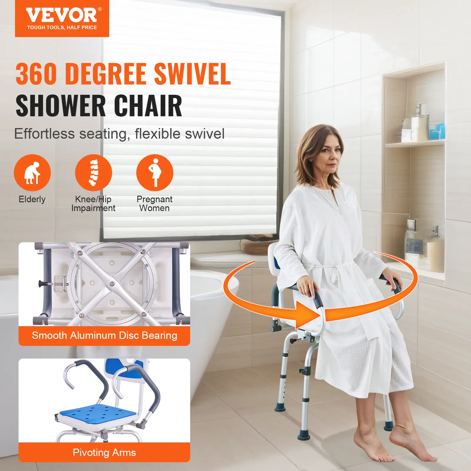 • 360° Swivel Chair with Pivoting Arms: Unlike standard shower chairs, VEVOR shower chair for elderly and disabled features a 360° rotating seat for easy pivoting when entering and exiting the bathtub. Plus, the pivoting armrests can be raised, lowered, and securely locked, making it easier to get in and out of the chair from any position. Ideal shower seats for elderly, disabled, handicapped or post-surgical.
