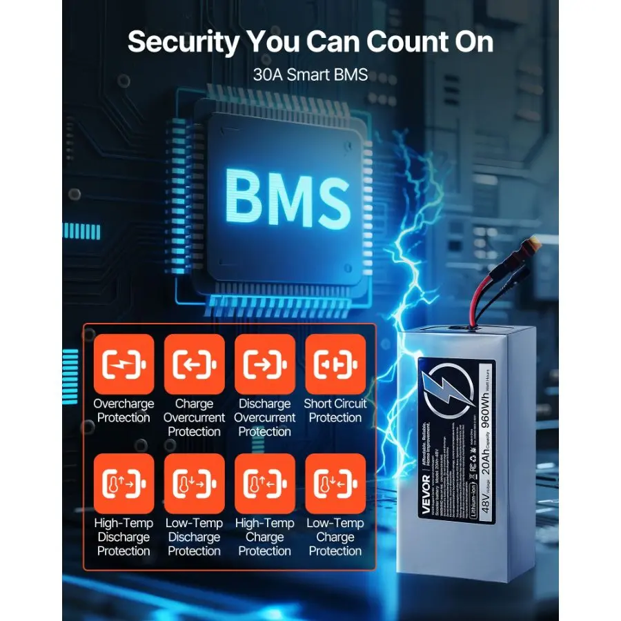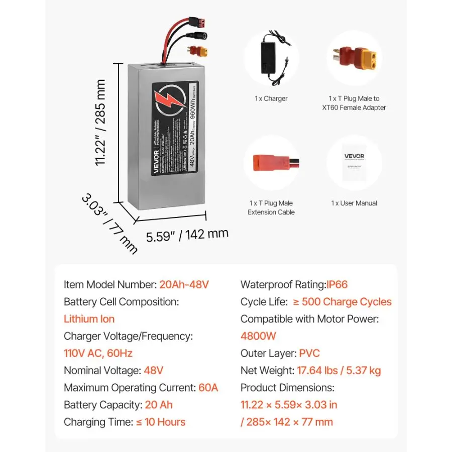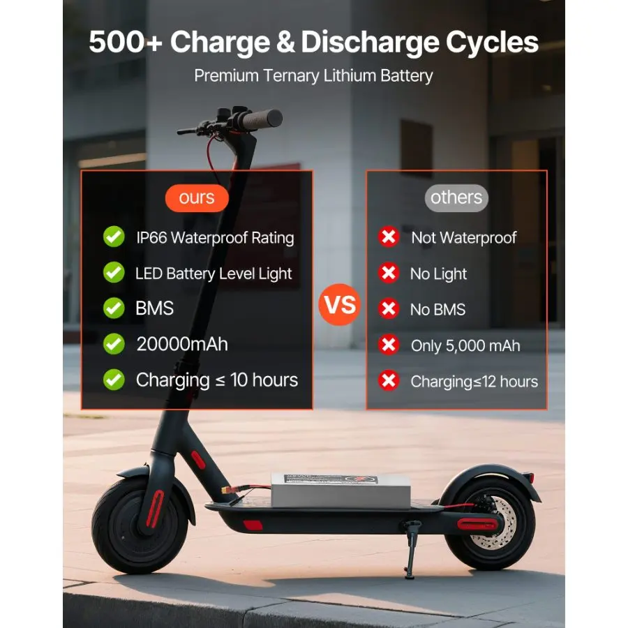 VEVOR 36V Electric Scooter Battery, 16Ah, Ebike Lithium Battery Pack with 30A BMS, Charger, T - Plug Expansion Cable, 500+ Cycles, Compatible with 2880W Motors, for Electric Bikes Bicycles, ScootersVEVOR 48V Electric Scooter Battery, 20Ah, Ebike Lithium Battery Pack with 30A BMS, Charger, T-Plug Expansion Cable, 500+ Cycles, Compatible with 4800W Motors, for Electric Bikes Bicycles, Scooters Power that Lasts Reliable Multi-Layer Protection All-Weather Performance Hassle-Free