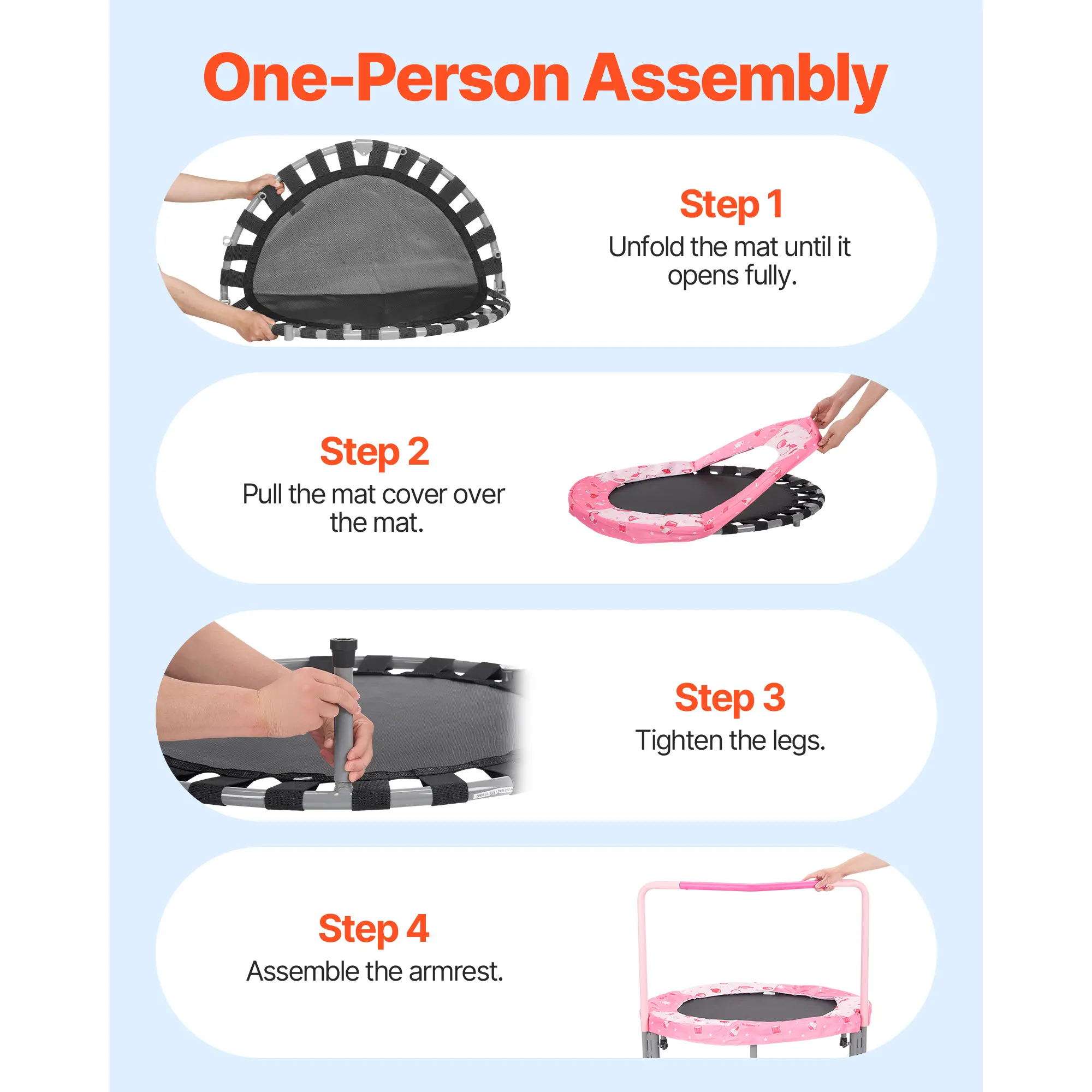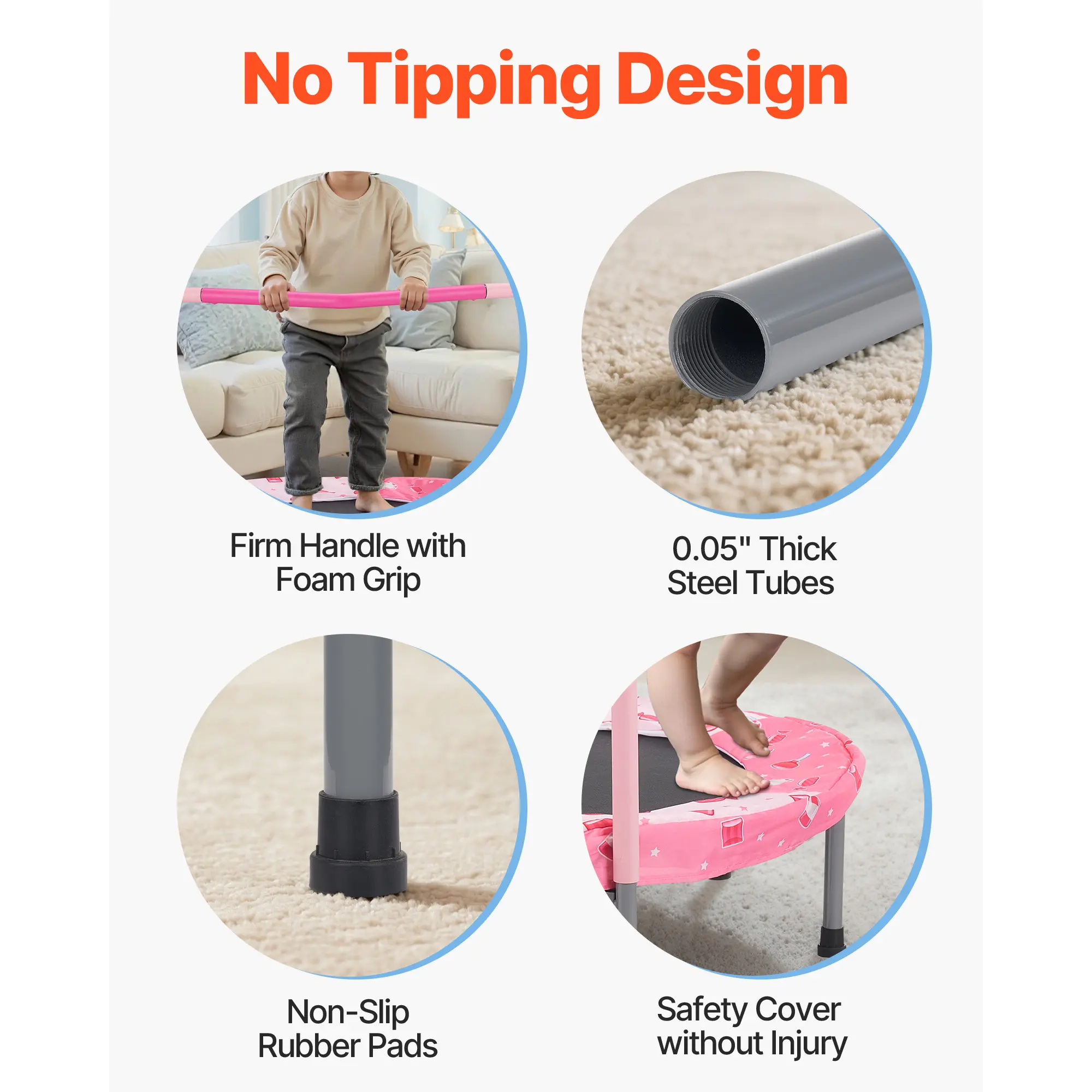 • Reinforced Legs: Constructed with a heavy-duty frame, PP jumping mat, safety pad covers, flat elastic bands, rubber-tipped leg tubes, and foam-covered handles, this mini baby toddler trampoline is built to last. The newly upgraded reinforced legs resist bending and deformation, ensuring solid stability. The rubber foot pads provide silent bouncing.