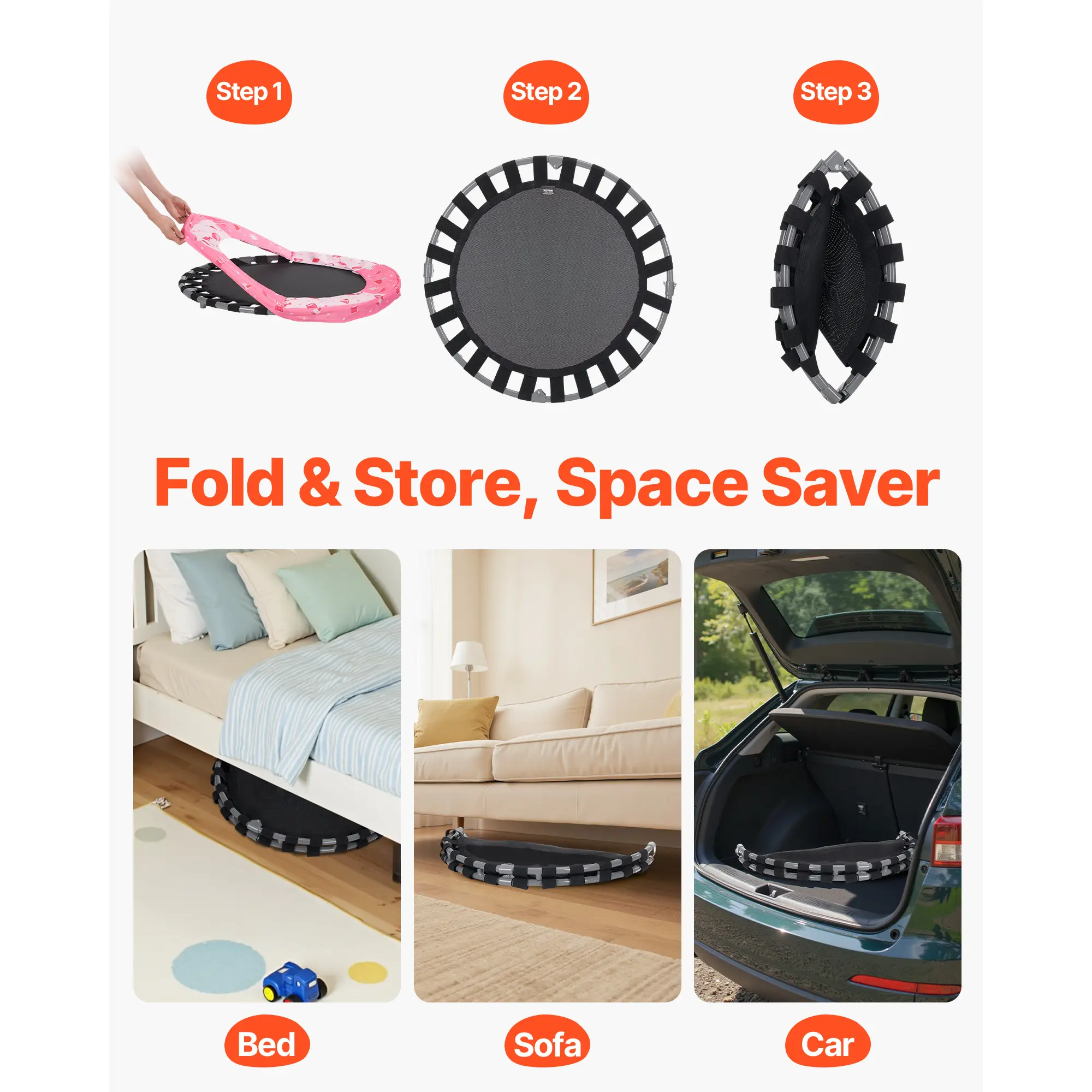 • Quick Storage with Foldable Design: Featuring a foldable frame design, our indoor outdoor toddler trampoline occupies only one-quarter of its original volume when folded, making storage easy and space-saving. It can be tucked away under a sofa or in the trunk of a car. The foldable design also makes it easy to move, allowing kids to jump wherever they like.