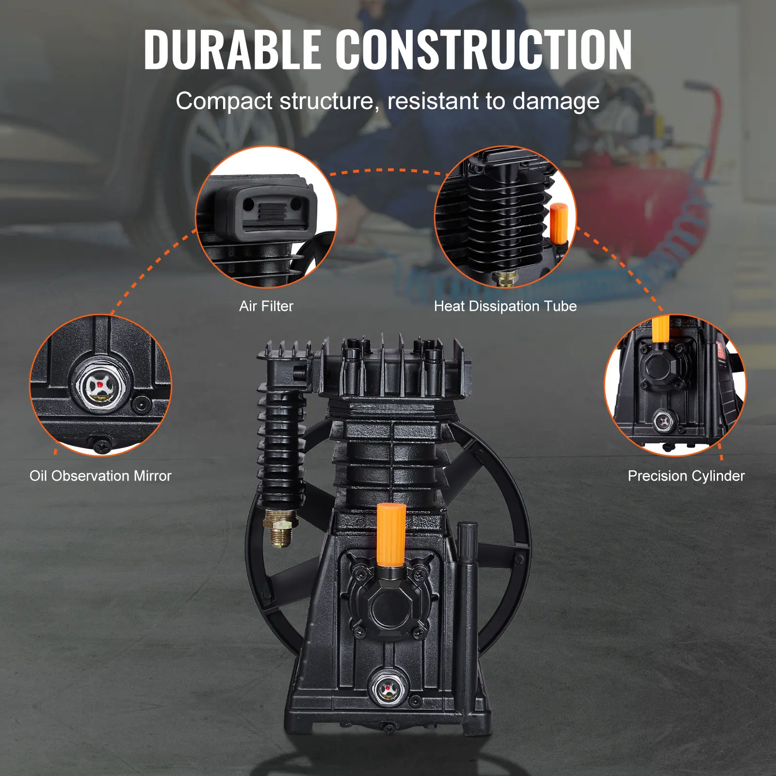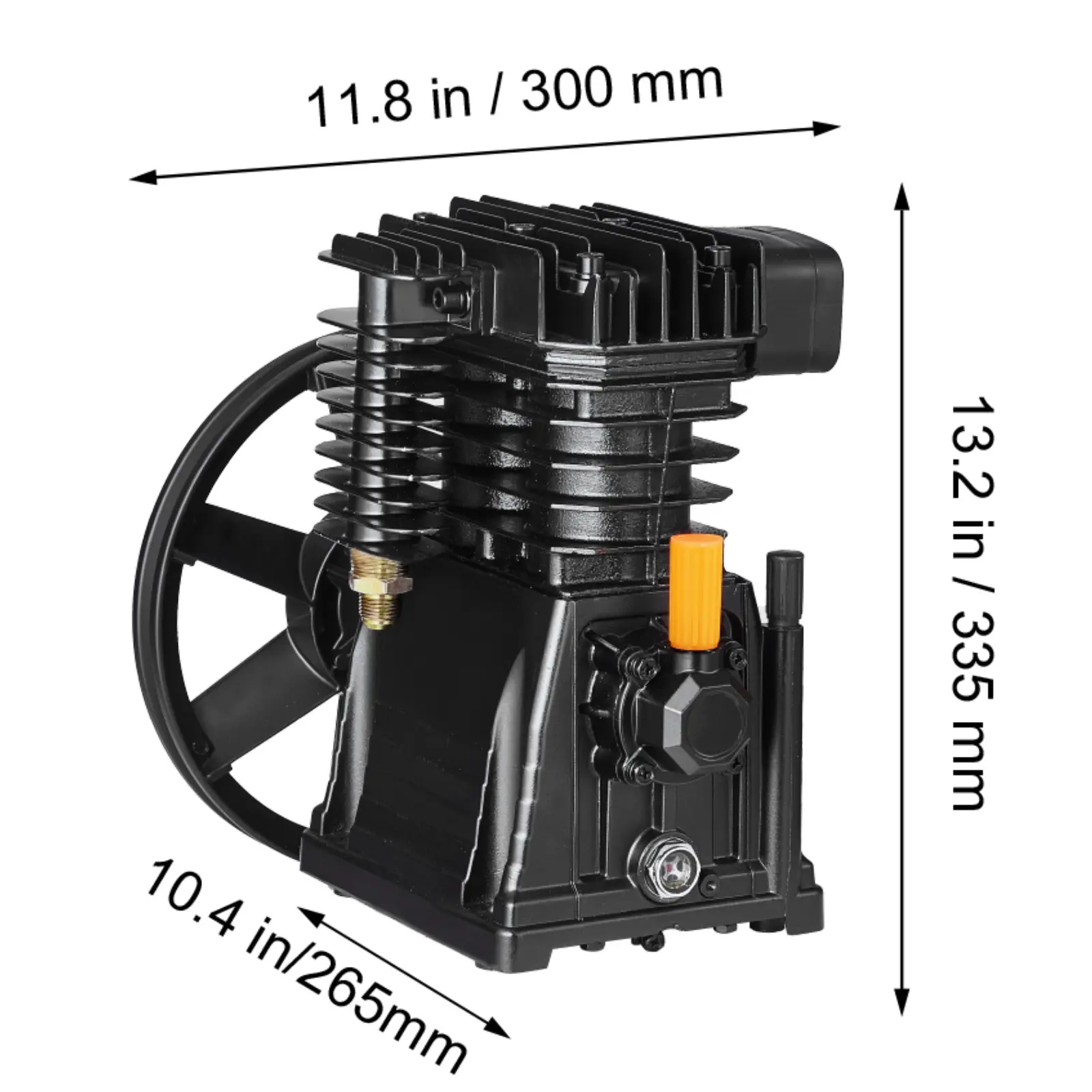 • 3HP Air Compressor Pump Head: VEVOR 3HP twin-cylinder air compressor pump head features 5.8 CFM @ 90 PSI air delivery rate and 116PSI max working pressure, provides a continuous and sufficient air supply for a wide range of equipment, ideal for tire inflation, spray painting, woodworking, and more tasks. (NOTE: Motor Not Included)