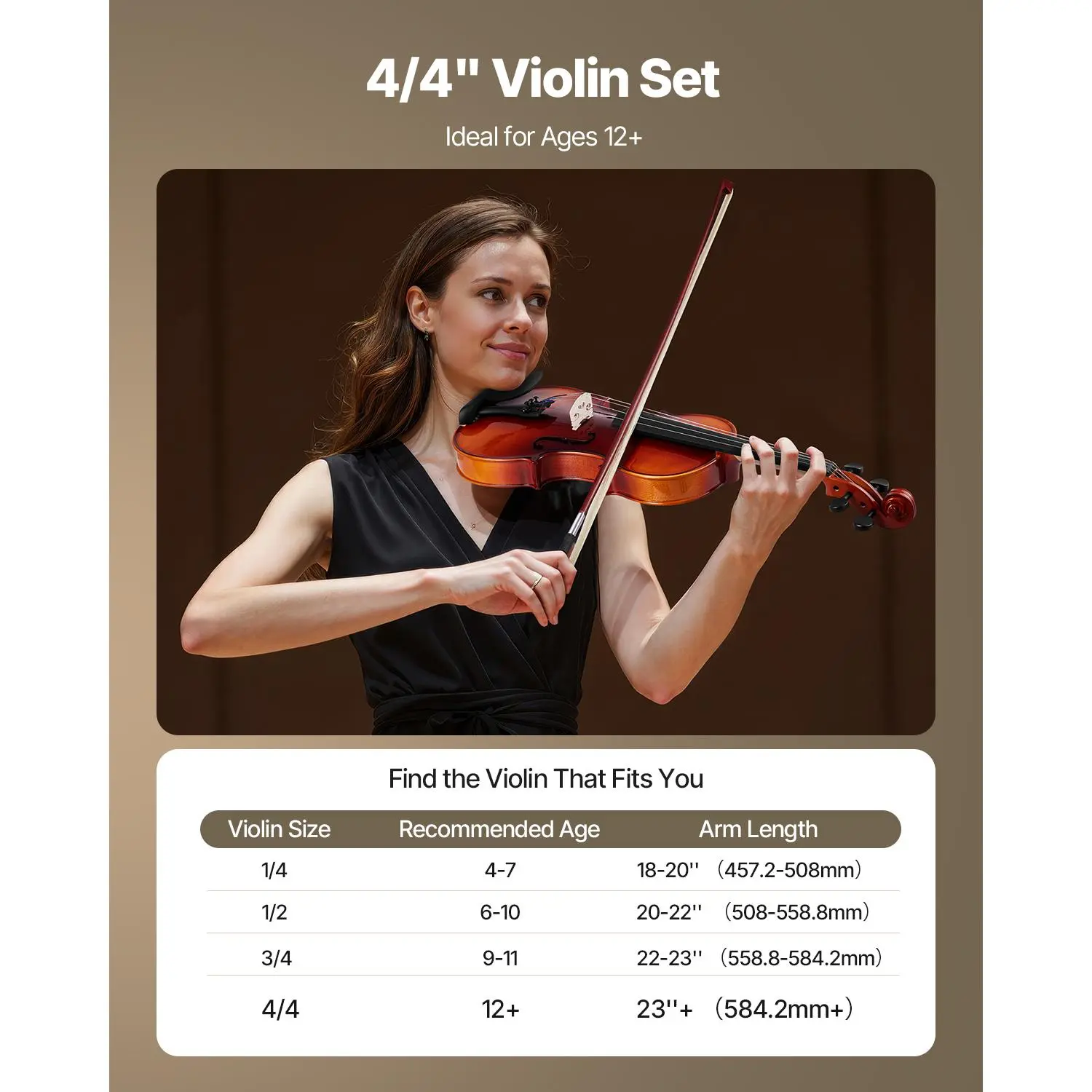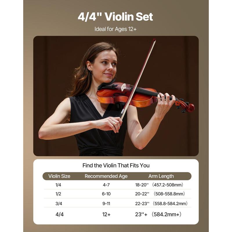 • 4/4 Violin: This size of violin is ideal for users aged 12+ with an arm length of 23+ inches(584.2+ mm). It is a ideal violin instrument for beginners or performers and is great for lessons, performances, or home practice