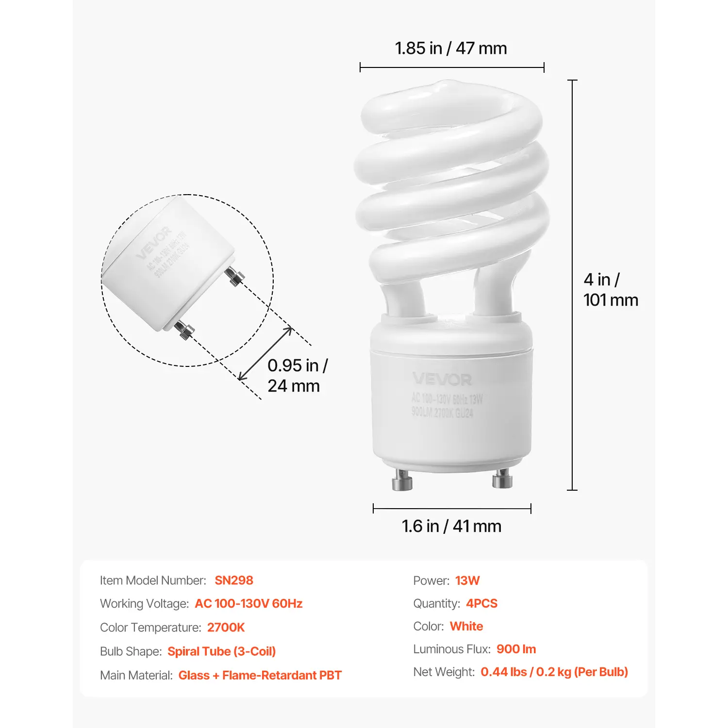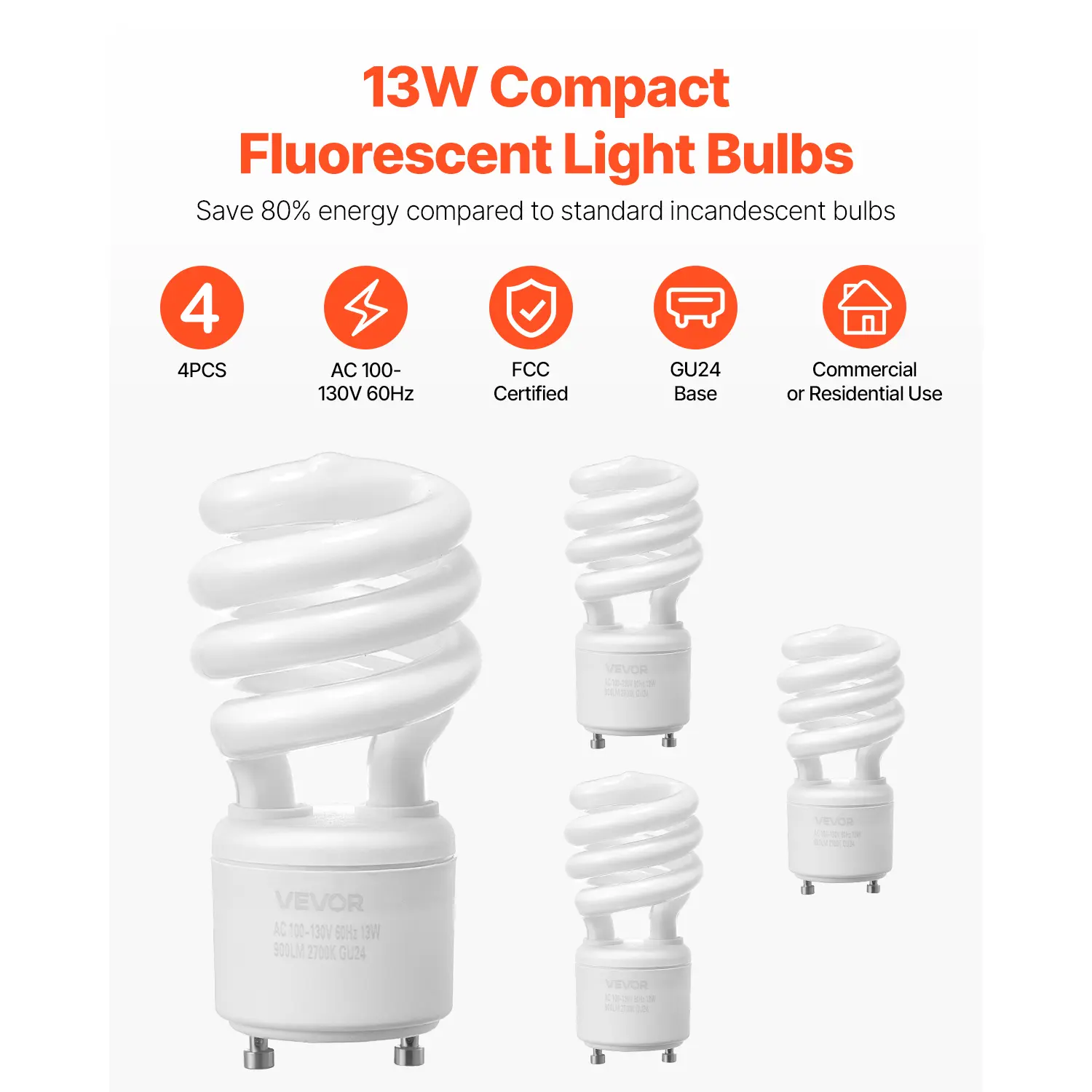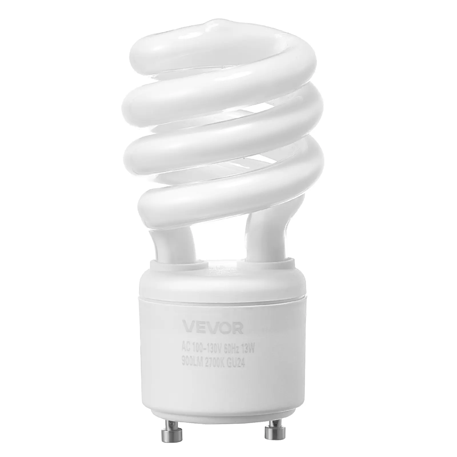 • Bright & Energy-Saving: The VEVOR 13W CFL light bulbs feature a GU24 base, 900lm luminous flux and 2700K warm color temperature, providing comfortable, soft lighting while saving 80% energy compared to standard incandescent bulbs. (Working Voltage: AC 100-130V 60Hz)