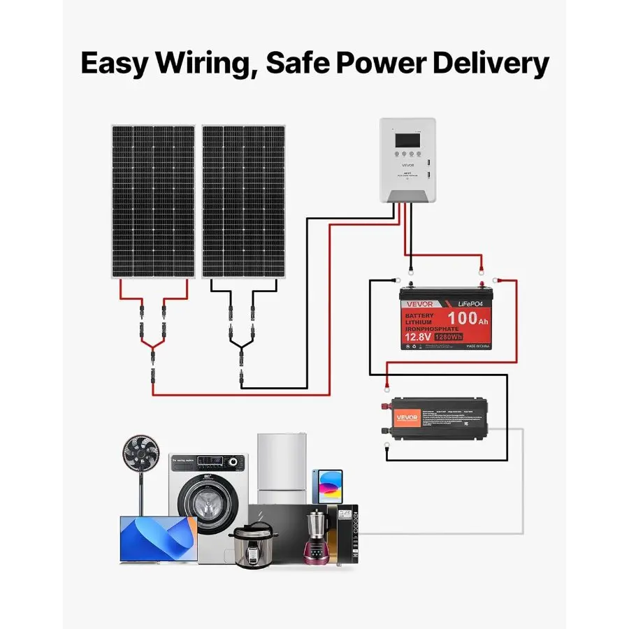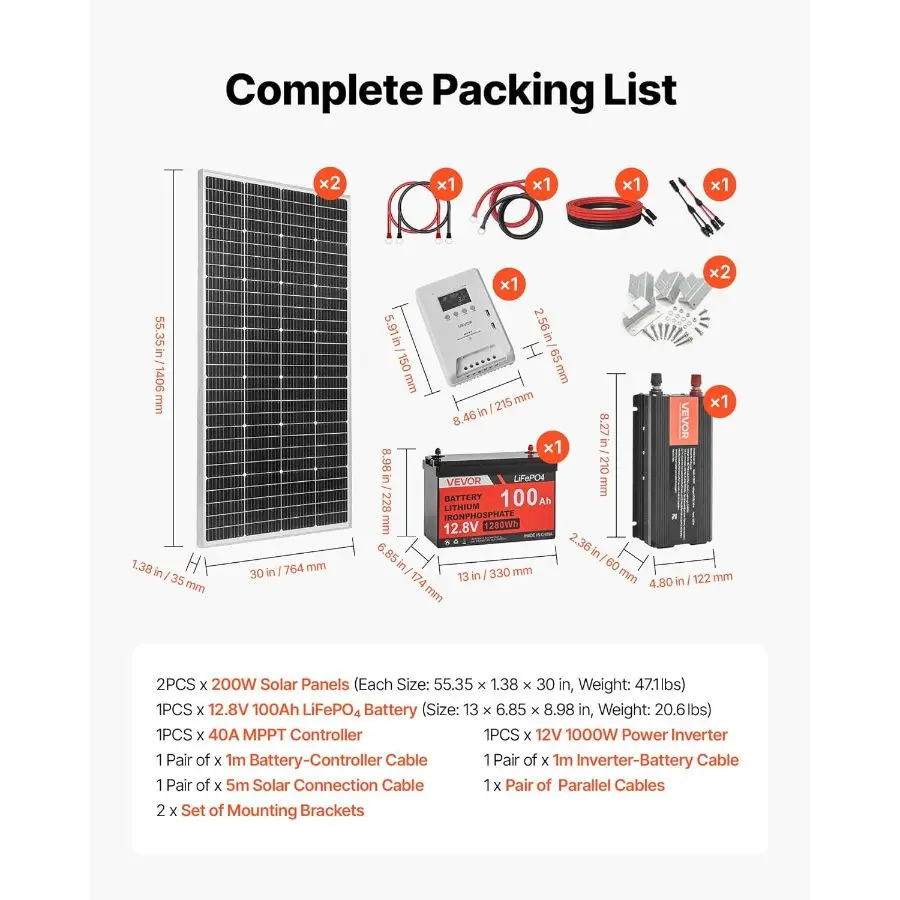 VEVOR 400W 12V Complete Solar Power Kit, 2PCS 200W Monocrystalline Solar Panels+ 12.8V 100Ah LiFePO Battery+ 40A MPPT Charge Controller+ 1000W Power Inverter for RV Home Camping Boats Off - GridVEVOR 400W 12V Complete Solar Power Kit, 2PCS 200W Monocrystalline Solar Panels+ 12.8V 100Ah LiFePO Battery+ 40A MPPT Charge Controller+ 1000W Power Inverter for RV Home Camping Boats Off - Grid