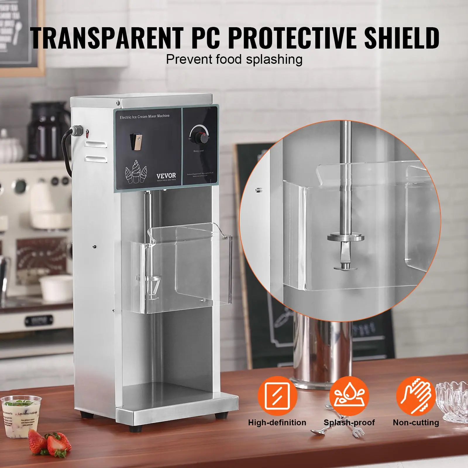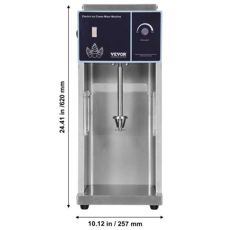 • User-Friendly Design: Includes a food-grade 304 stainless steel cup ring that snugly fits paper cups with tapered top and bottom diameters, providing a secure grip during mixing without slipping. Three sizes of cup rings match three hand cup capacities (9/12/16 oz). A transparent PC splash guard effectively prevents splashing of ice cream and ingredients. Four rubber feet on the bottom enhance stability.