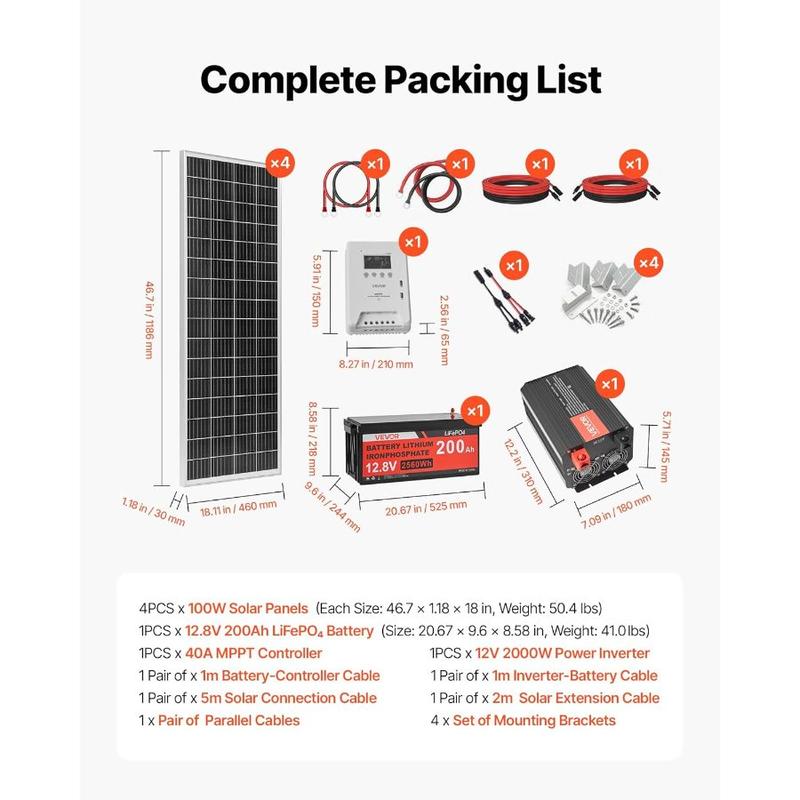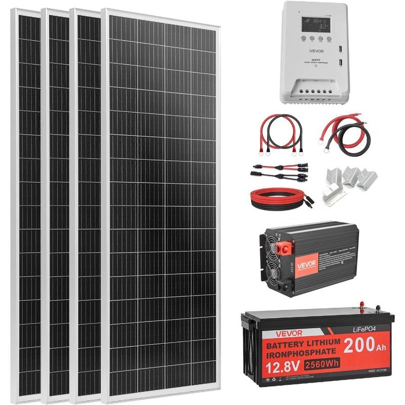VEVOR 400W 12V Complete Solar Power Kit, 4PCS 100W Monocrystalline Solar Panels+ 12.8V 200Ah LiFePO Battery+ 40A MPPT Charge Controller+ 2000W Power Inverter for RV Home Camping Boats Off - GridVEVOR 400W 12V Complete Solar Power Kit, 4PCS 100W Monocrystalline Solar Panels+ 12.8V 200Ah LiFePO Battery+ 40A MPPT Charge Controller+ 2000W Power Inverter for RV Home Camping Boats Off - Grid