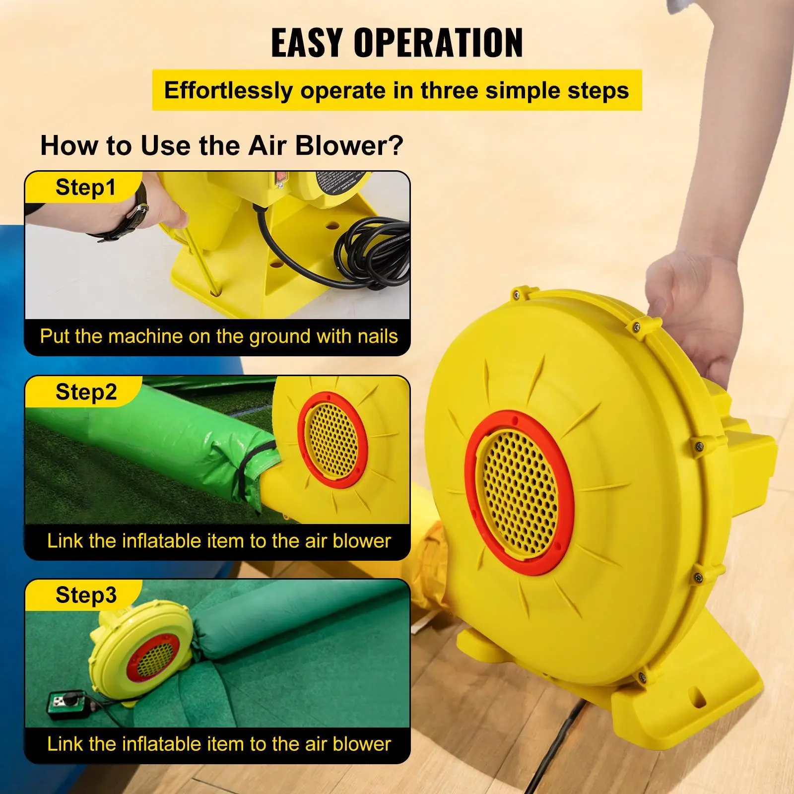 • Enjoy Inflating More: Our durable air blower for inflatables is Tested to Standards, with a wide range of uses indoors and outdoors. It’s suitable for bounce houses, water slides, obstacle courses, paint booth air sofas, and other suitable inflatable bouncers.