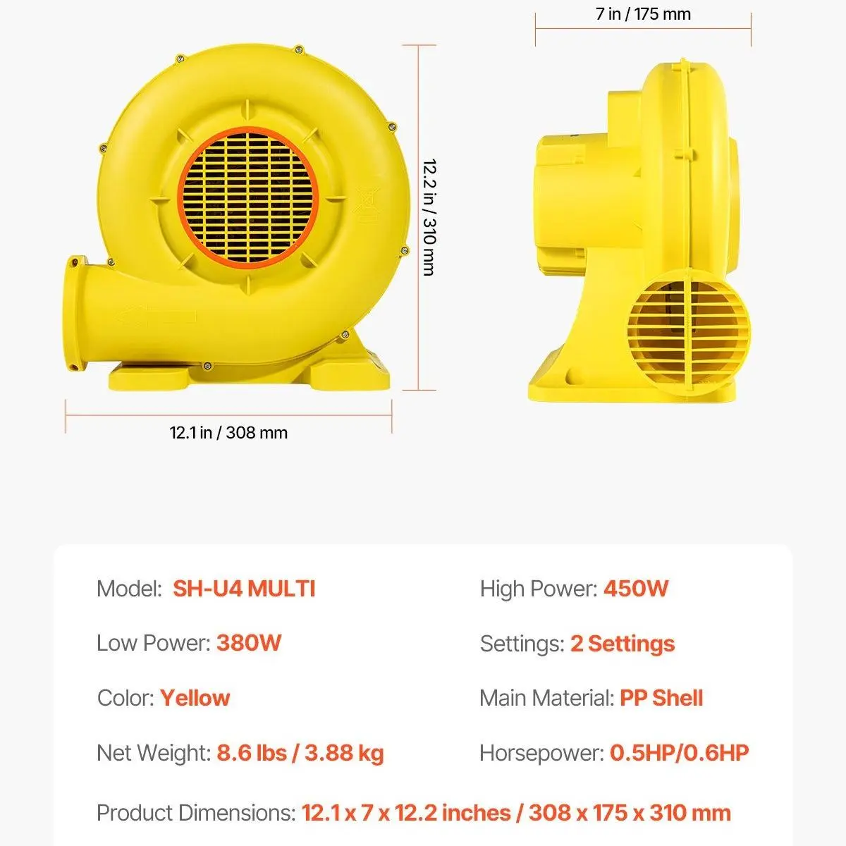 • 450W Powerful Blower: Our air blower is equipped with a 450W 4.2A super motor, providing strong impetus and saving more energy. Horsepower: 1.25HP. Input Voltage: 110V-120V AC/60Hz. Outlet Diameter: 4.1 in/10.5 cm. The air volume is 450 m³/h, so you can fill the inflatable that you need quickly without effort.