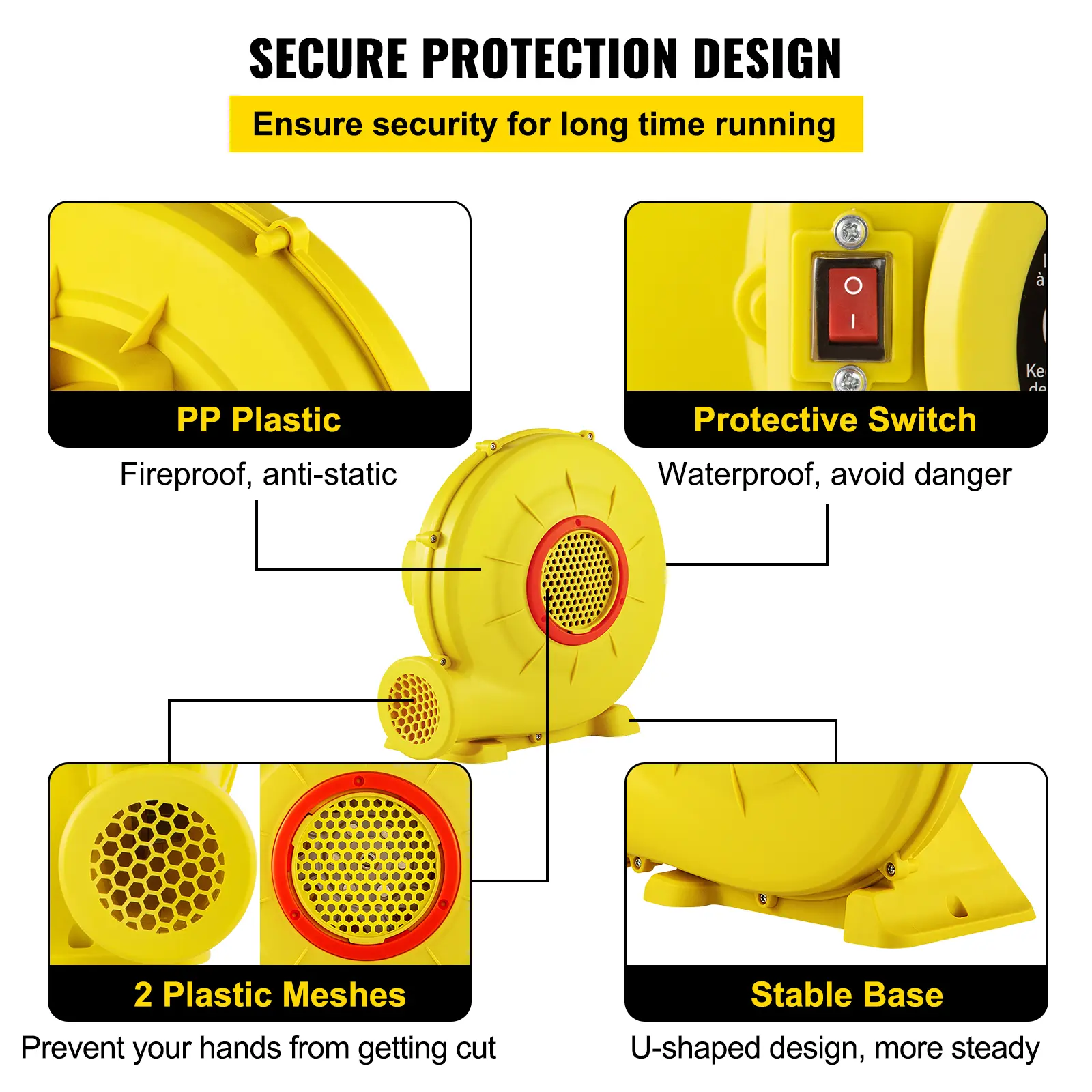 • Secure Protection Design: This bounce house blower is excellent for any inflatable with a high-security design. It is made of high-quality PP plastic, fireproof and anti-static. The switch has a transparent hood layer, making it secure for you to turn on/off if water is present. Besides, there are two plastic meshes covering 2 vents to help your hands avoid getting cut.