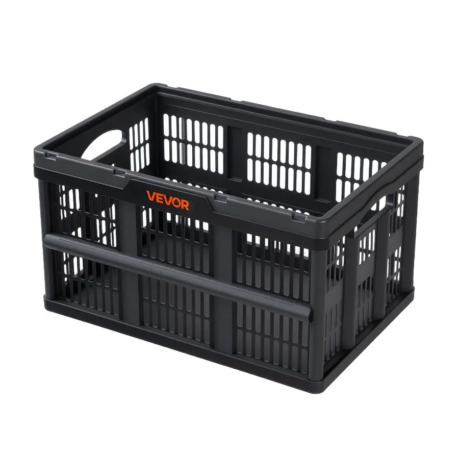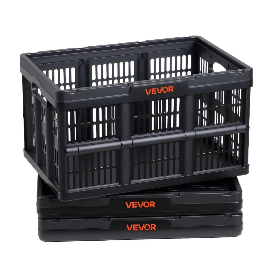 VEVOR Plastic Collapsible Storage Bins, 45L 3 Packs, Stackable Folding Storage Crates with Handles, Holds 33 lbs Per Bin, Foldable Heavy Duty Containers, Space-Saving Baskets, for Home OrganizingLightweight CrateStable Folding StructureHand-Friendly DesignVentilated DesignReady for Any SettingOne Crate, Many UsesProduct Dimensions (Open): 20.7x 14.0x 11.6 in/ 525x 355x 295 mm, Folded Height: 2.6 in/ 65 mm, Item Model Number: ZJKS5336295W, Quantity: 3 Pack, Capacity (per crate): 45 L, Material: PP, Max Load Capacity (per crate): 33 lbs/ 15 kg