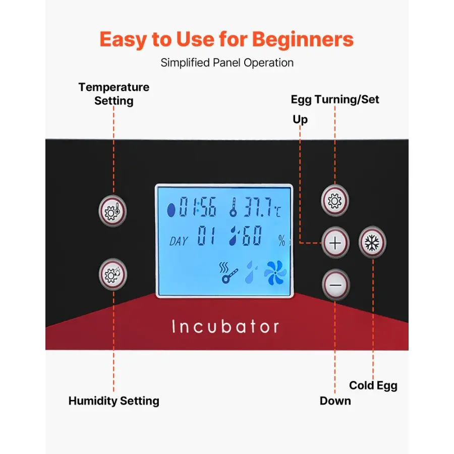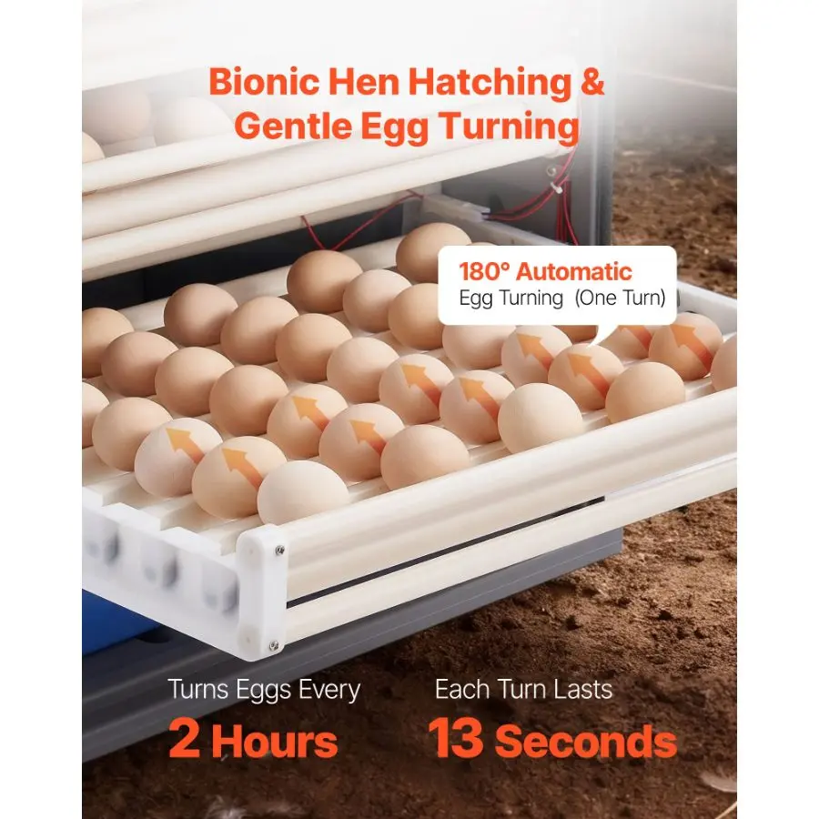 VEVOR 48 Egg Incubator, Automatic Egg Turner with LED Candler, Temperature Display Auto Humidity Control, 360 View Clear Window, Poultry Eggs Incubator for Hatching Chicks Ducks Goose QuailVEVOR 400 Egg Incubator, Poultry Incubator Cabinet with Automatic Eggs Turning, Temperature & Humidity Control, Heating & Cooling Egg Hatcher, Commercial Incubators for Hatching Chicks Ducks Goose Fan Asisted Airflow Circulation 180° Automatic Egg Turning (One Turn) Large Capacity Easy