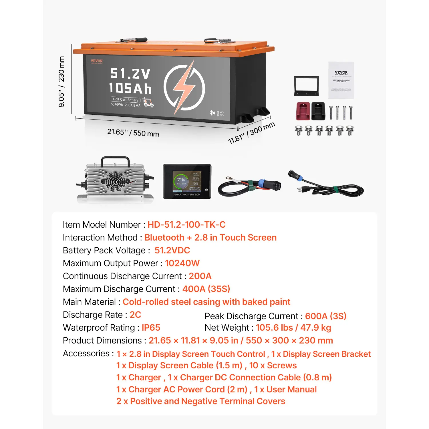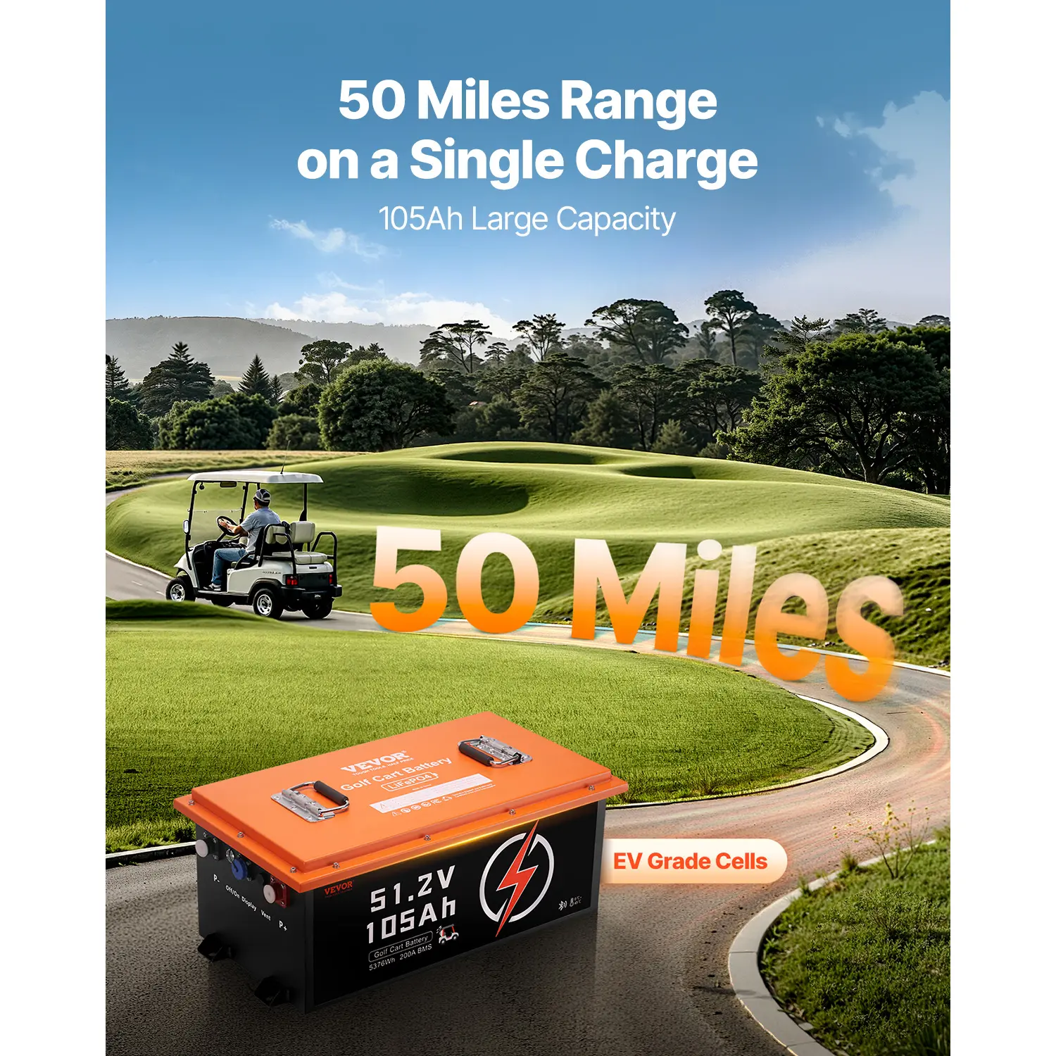 • Exceptional Performance: The 51.2VDC 105Ah LiFePO4 golf cart battery is made with EV-grade LiFePO4 cells, delivering outstanding performance. Say goodbye to range anxiety-enjoy a 50-mile range on a single charge.