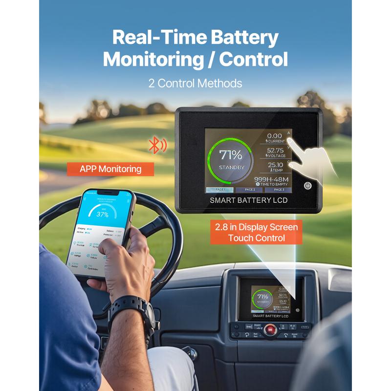 • 2.8 in Touchscreen: You can connect the 48V golf cart lithium battery via the mobile app or directly through the LCD screen to instantly view or control battery information, such as charge/discharge status. With Bluetooth interaction and a touchscreen LCD, operation is easy and convenient.