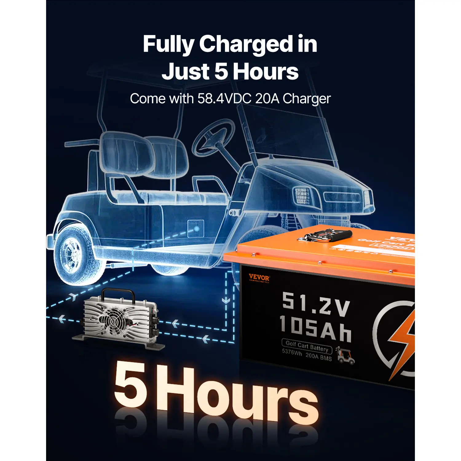 • 5-Hour Fast Charging: This lithium battery comes with a 58.4VDC 20A charger, fully charging the battery in just 5 hours. The aviation-grade connector makes wiring flexible and easy, while the IP65 waterproof rating ensures security and reliability.