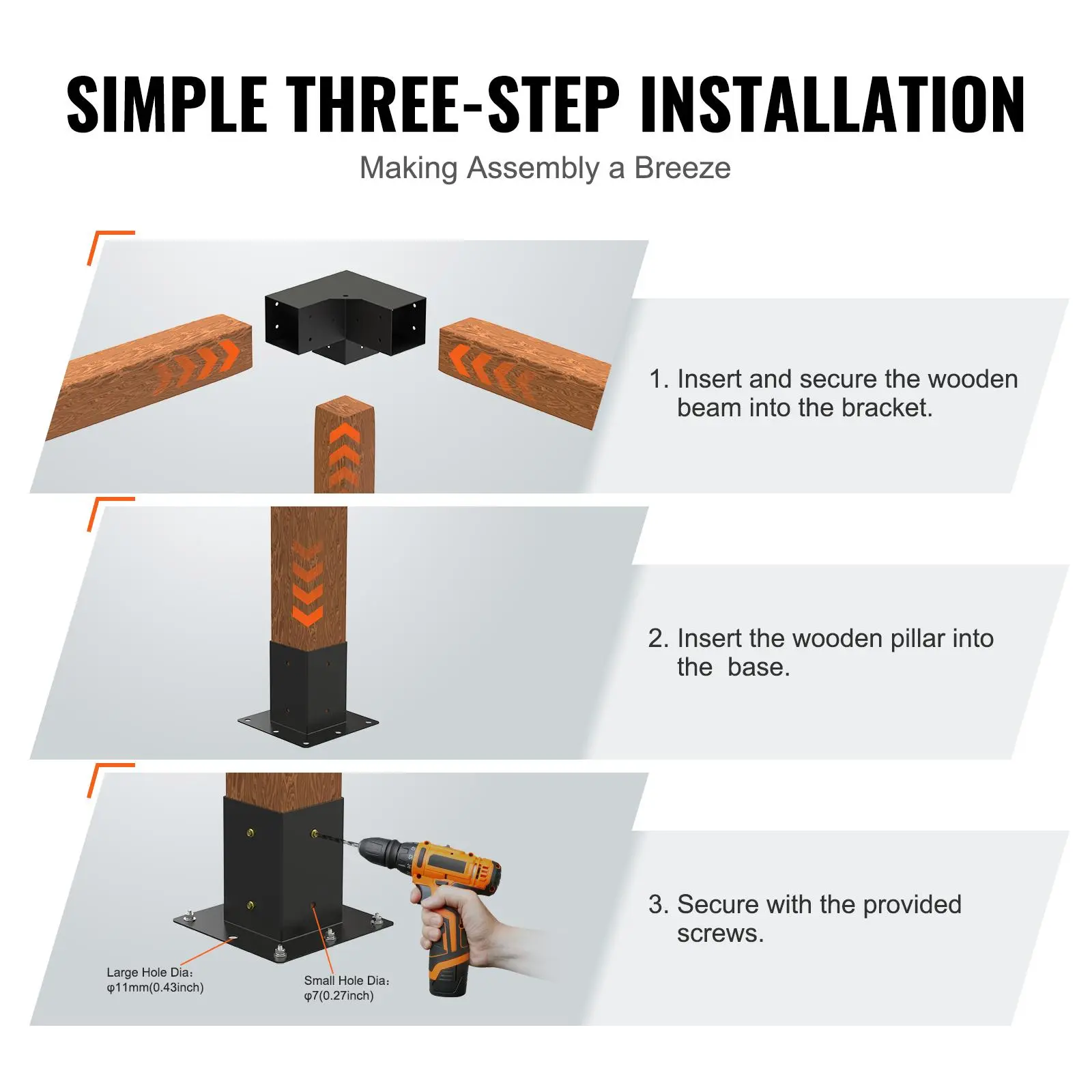 • 4" x 4" Three-Way Pergola Brackets: This durable and strong pergola bracket kit that covers wooden beams, preventing them from rotting due to rainwater and harsh sunlight. It is designed for the mainstream 4" x 4" specifications and can accommodate actual dimensions of 3.6 x 3.6 inches (92 x 92 mm) for both soft and hardwood.