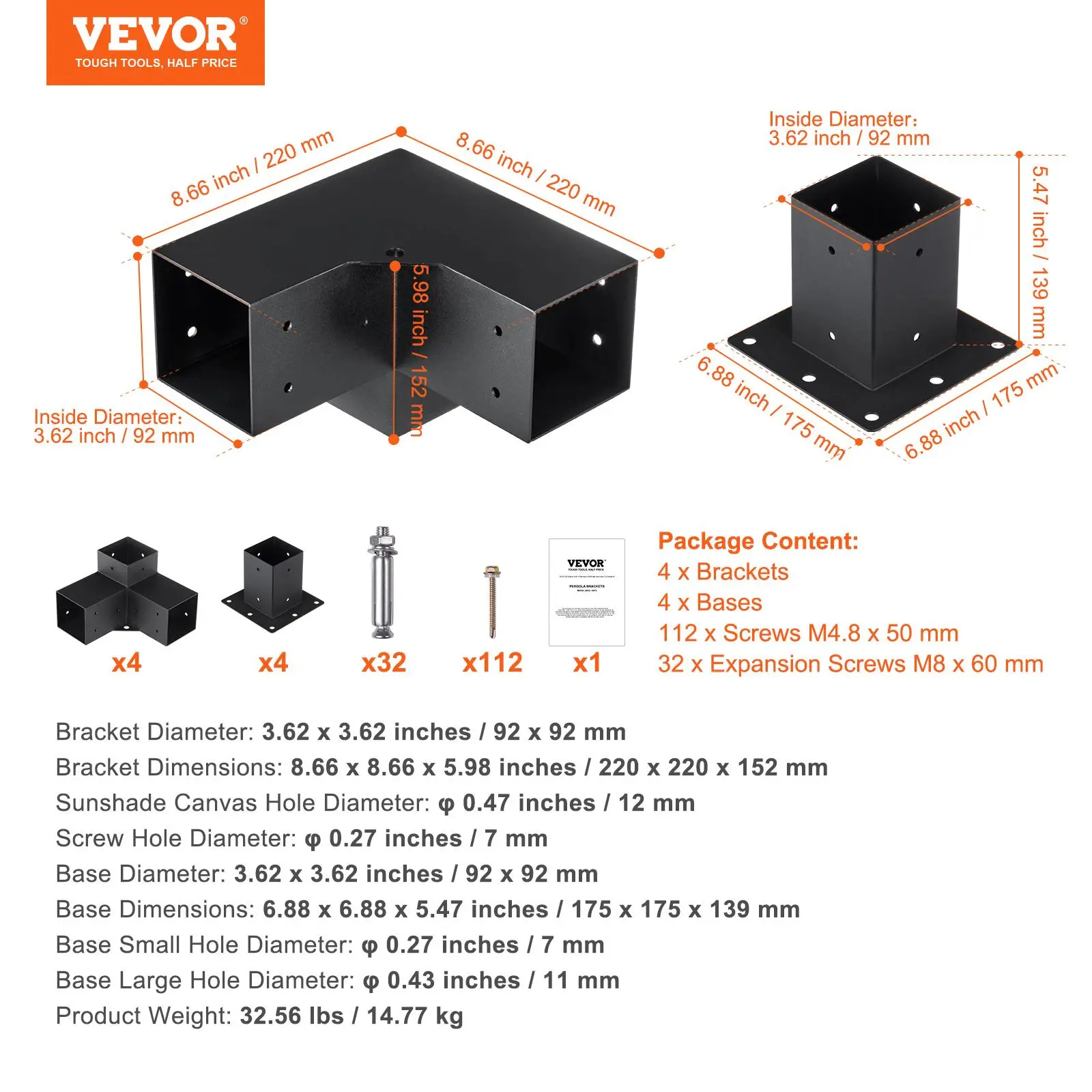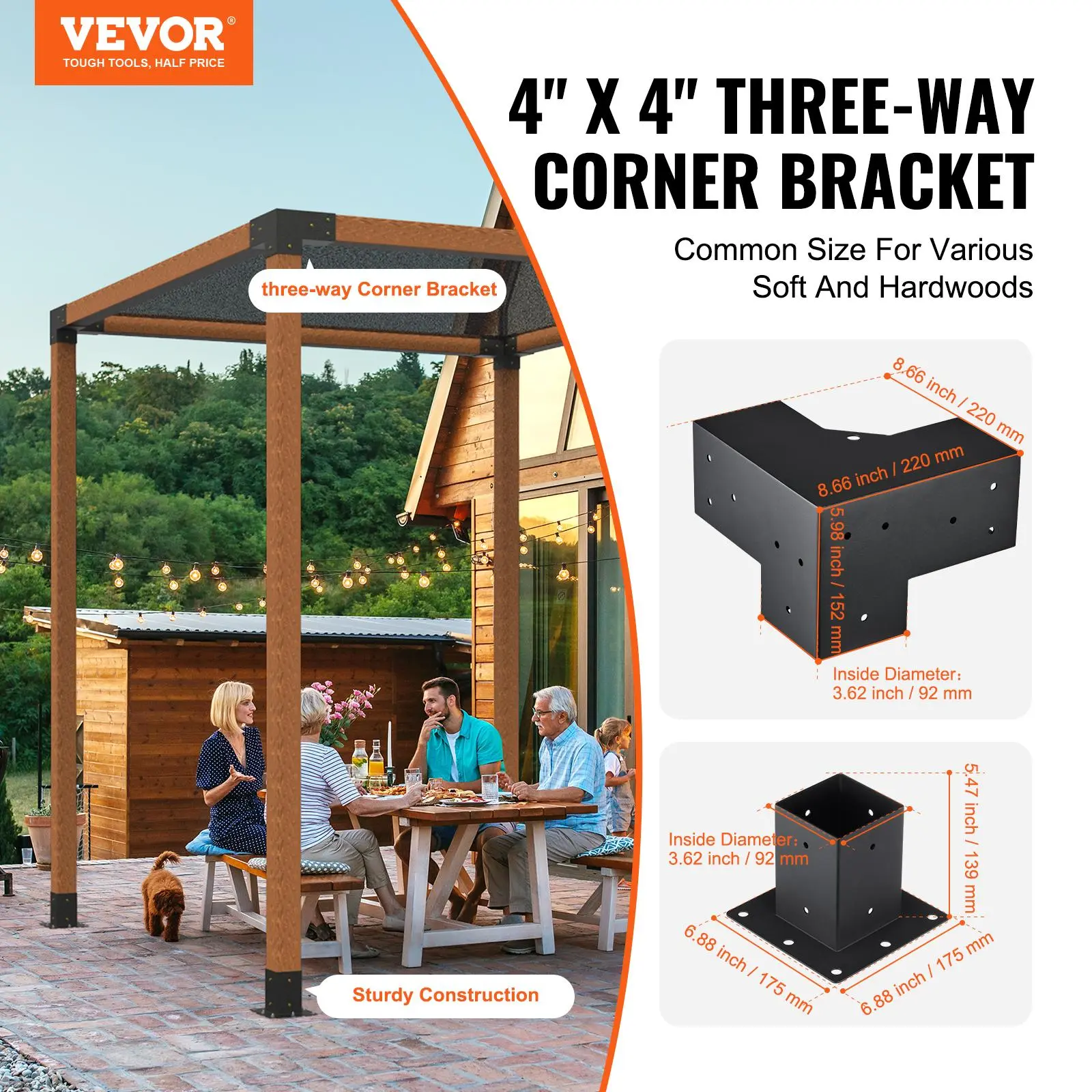 • 4" x 4" Three-Way Pergola Brackets: This durable and strong pergola bracket kit that covers wooden beams, preventing them from rotting due to rainwater and harsh sunlight. It is designed for the mainstream 4" x 4" specifications and can accommodate actual dimensions of 3.6 x 3.6 inches (92 x 92 mm) for both soft and hardwood.