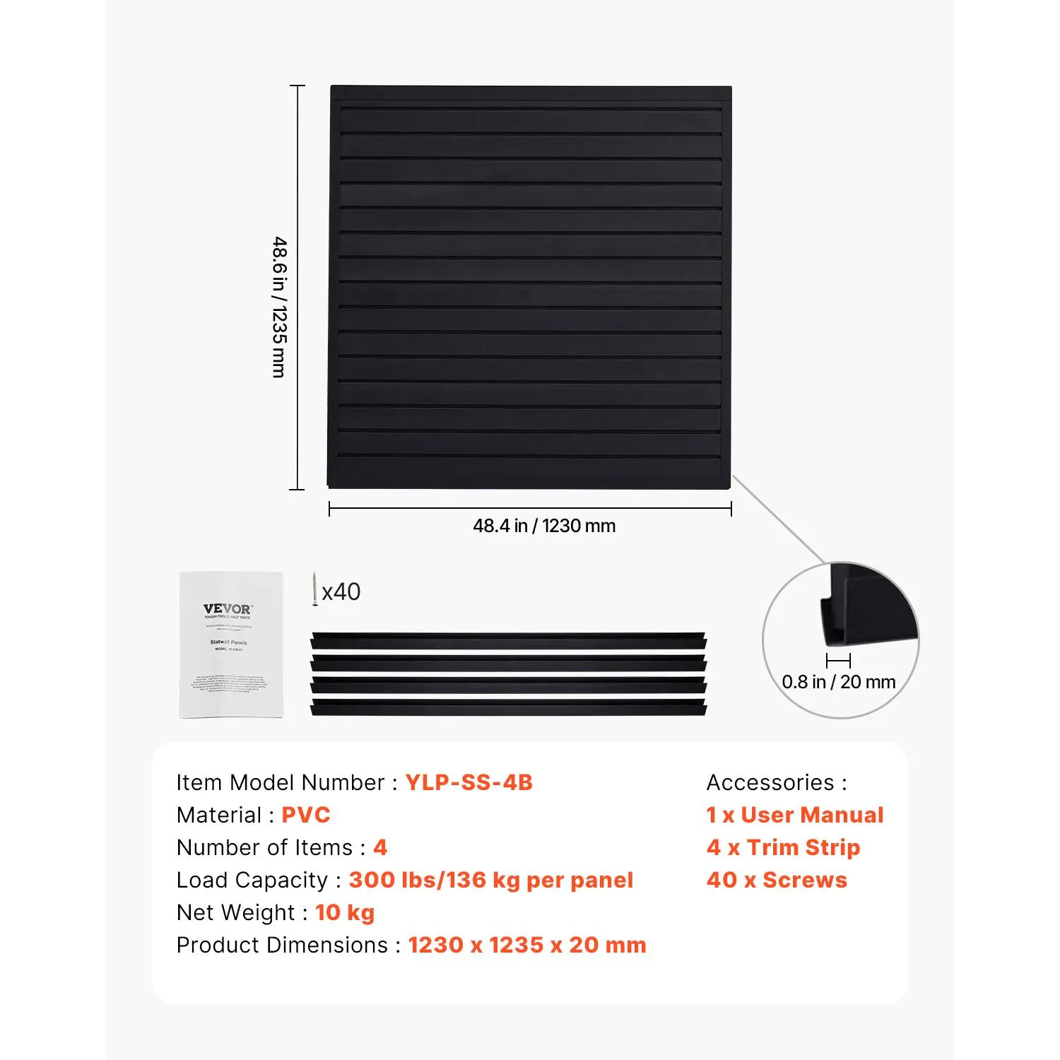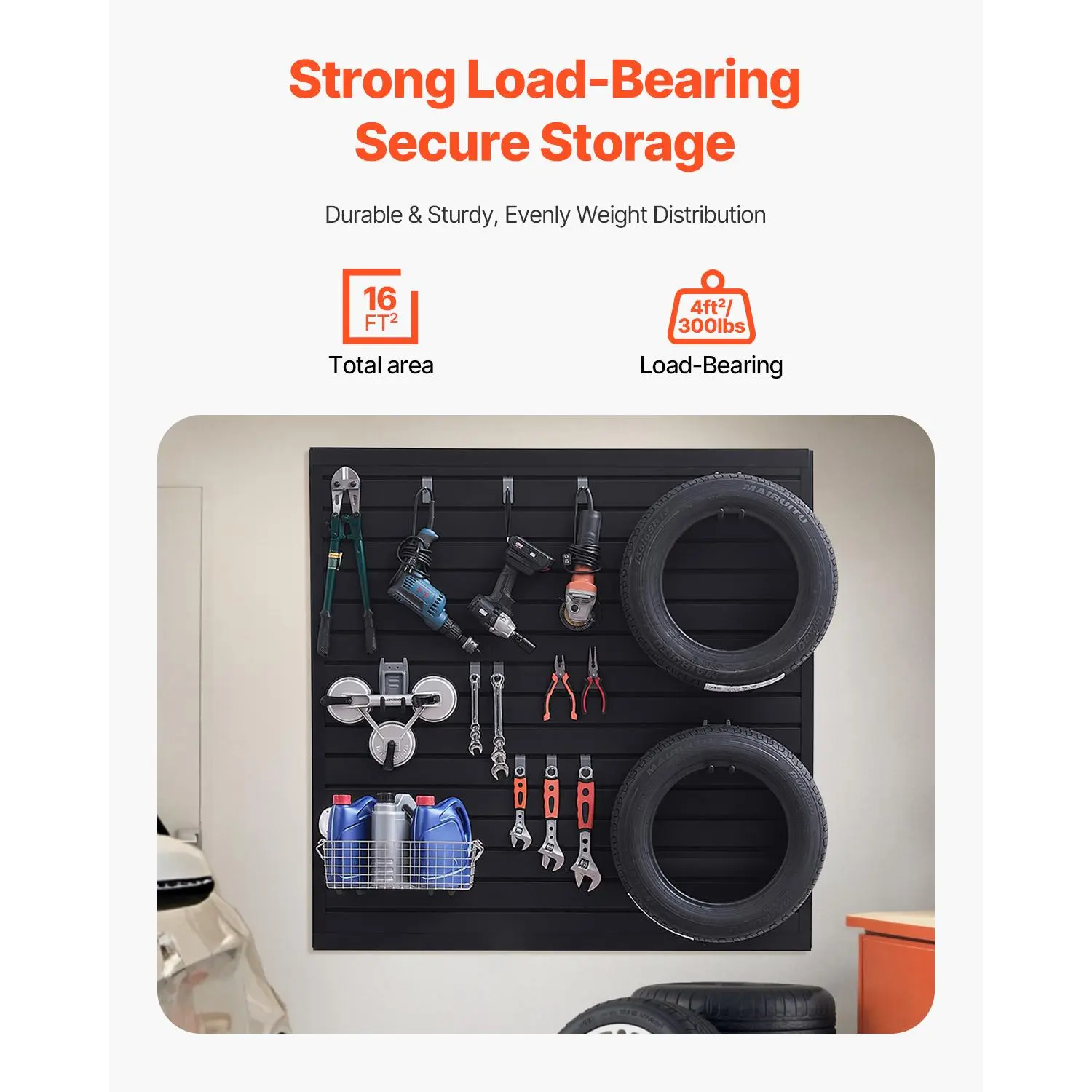 • Strong Load-Bearing Capacity: The slat wall panel can support up to 300LBS/4ft², providing stable and efficient storage for various heavy items such as hammers, drills, ladders, and more, making it ideal for use in garages, workshops, and other spaces.