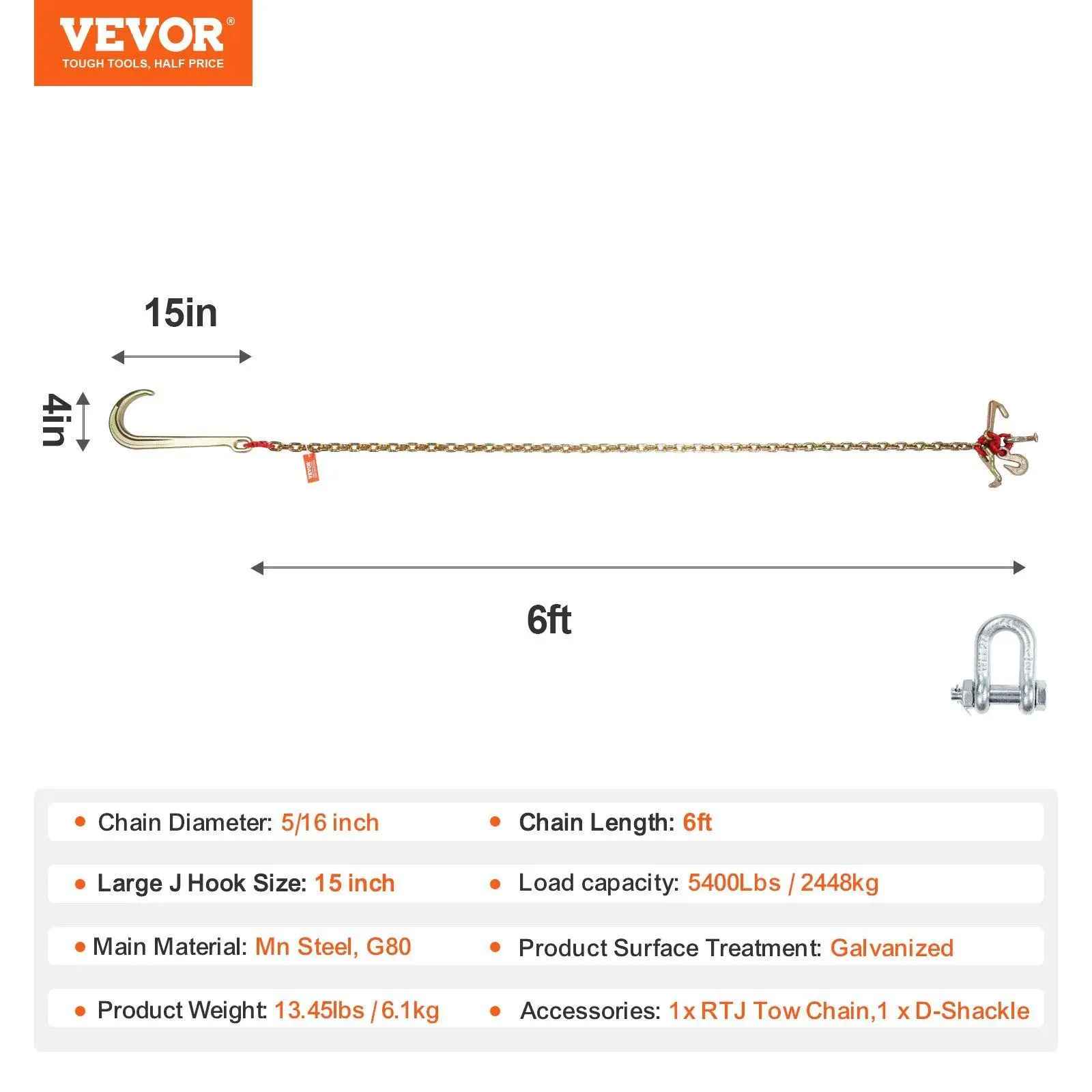 ·9260 lbs Load Capacity: Our tow chain has a load limit of 9260 lbs and 4:1 security factor. Diameter: 5/16 inch; Chain Length: 3 ft. Thanks to these features, you can use it with no worries.