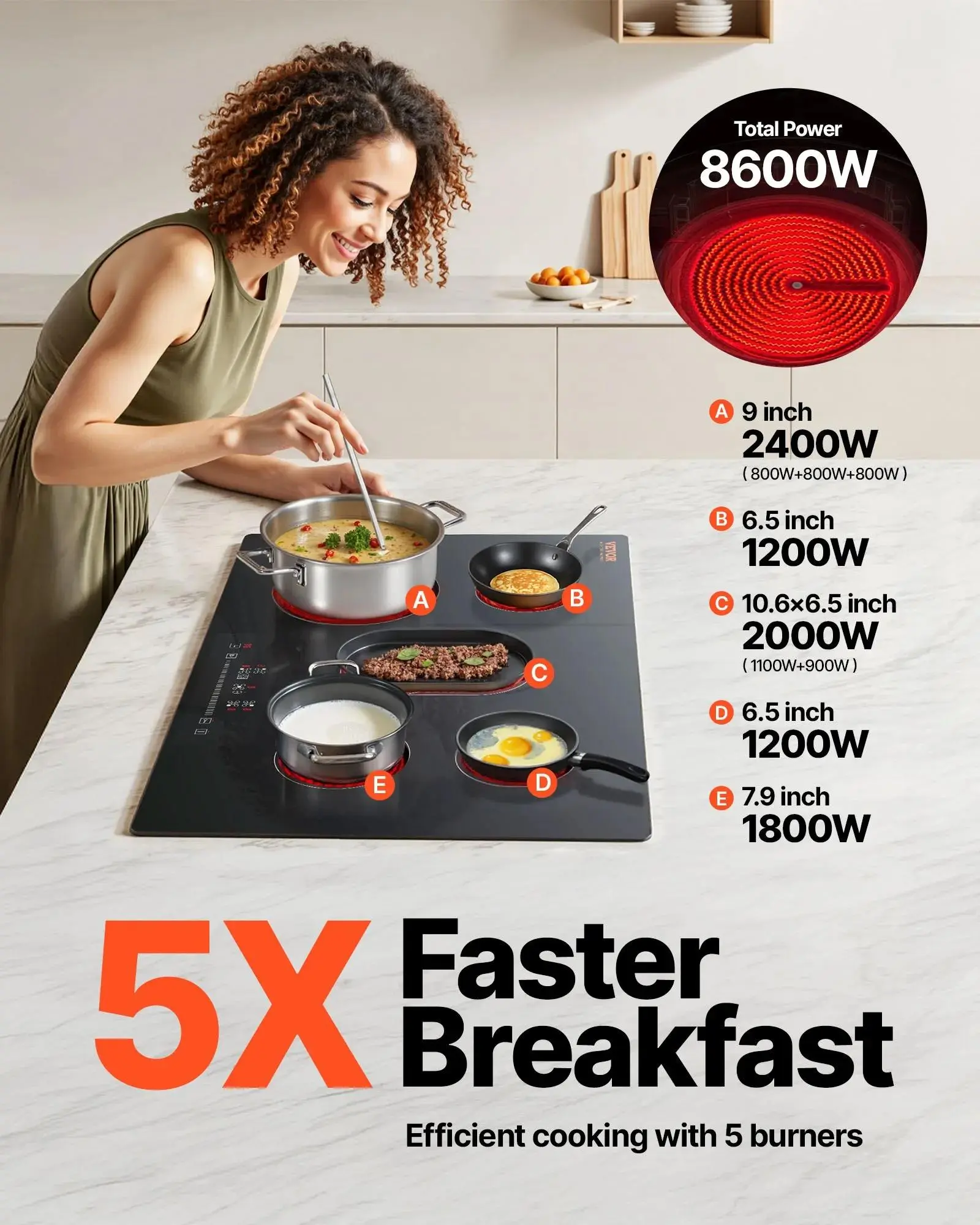 ·5 Independent Zones: Our ceramic cooktop features 5 independent cooking zones with a total power of 8600W.