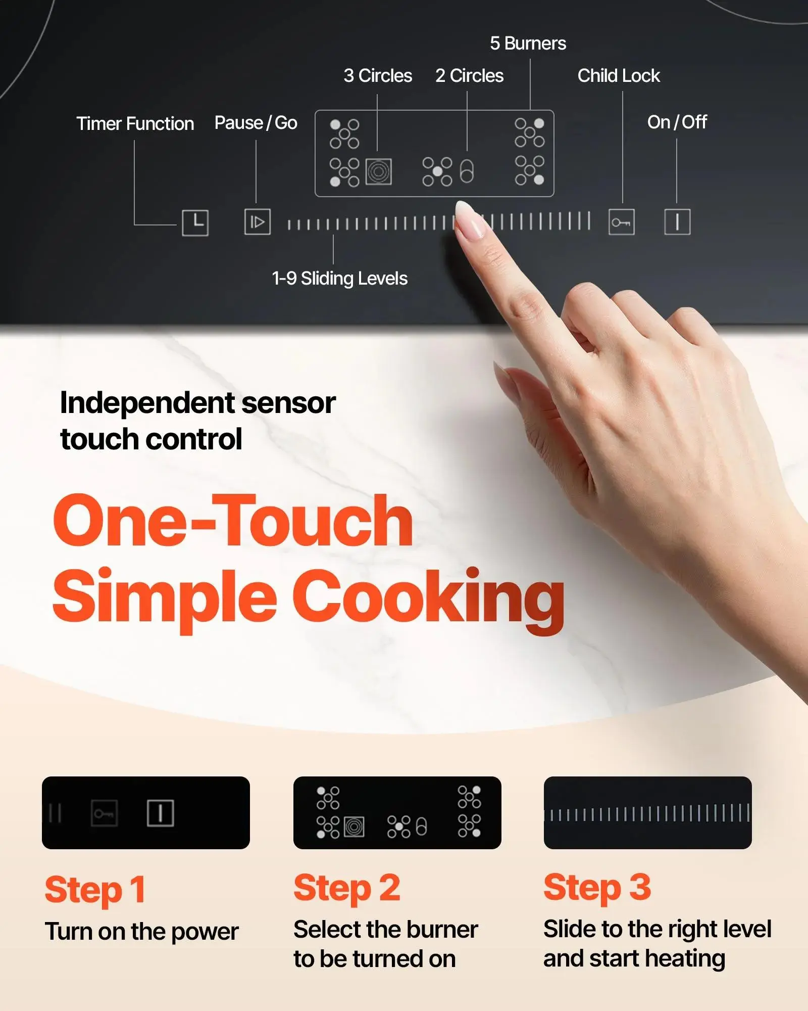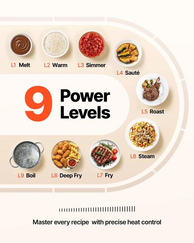 ·Timer: The 1-99min timer makes cooking easy and enjoyable. Set the power and timer, and let the cooktop do the rest.