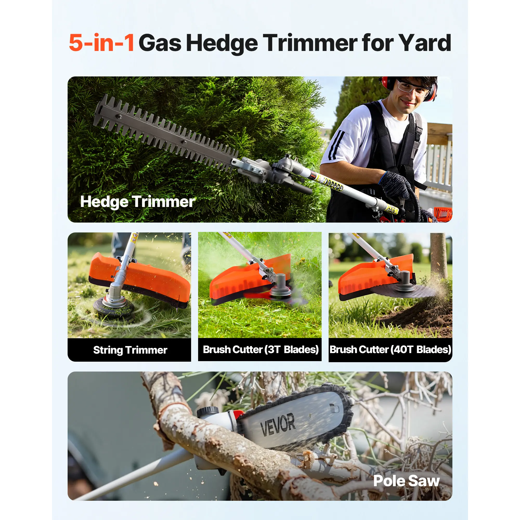 • 5-in-1 Multi-Function: Our gas hedge trimmer includes hedge trimmer, string trimmer, brush cutter (3T & 40T blades) and pole saw, covering all yard tasks such as lawn edging, thick branch cutting, and high hedge trimming