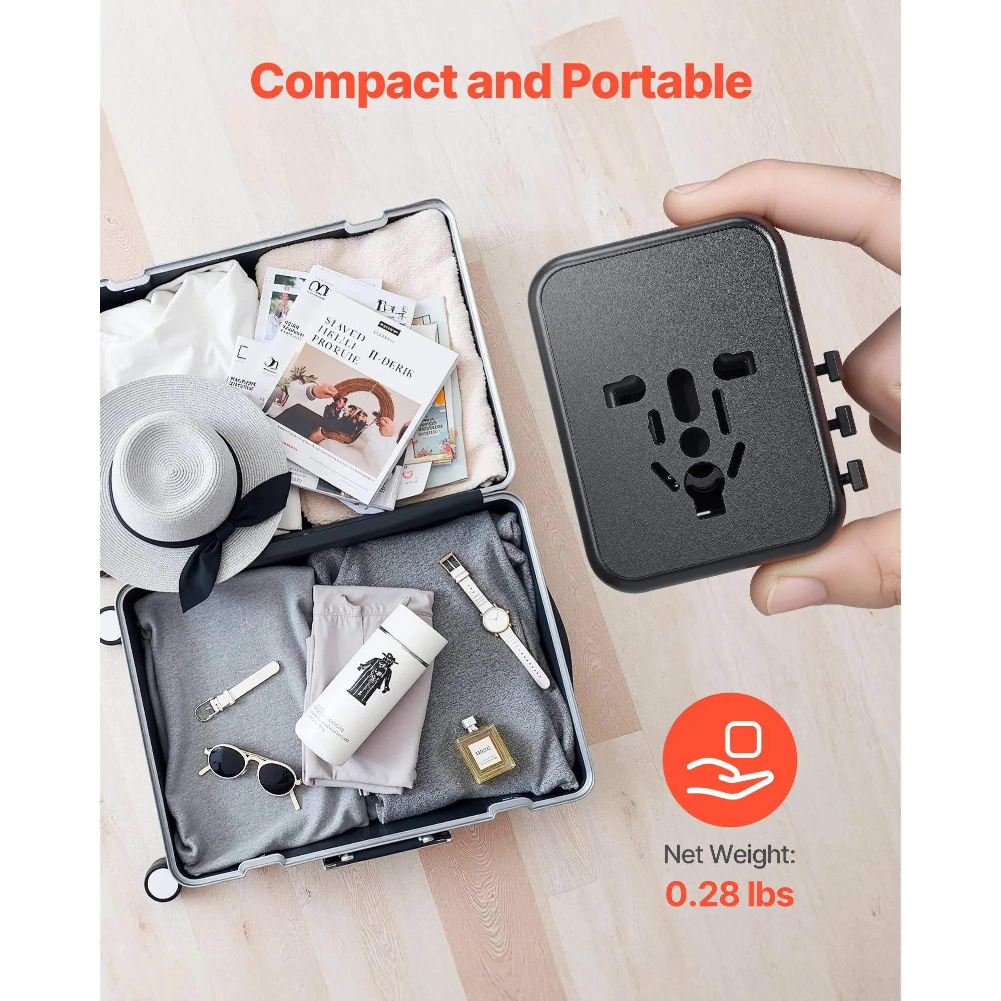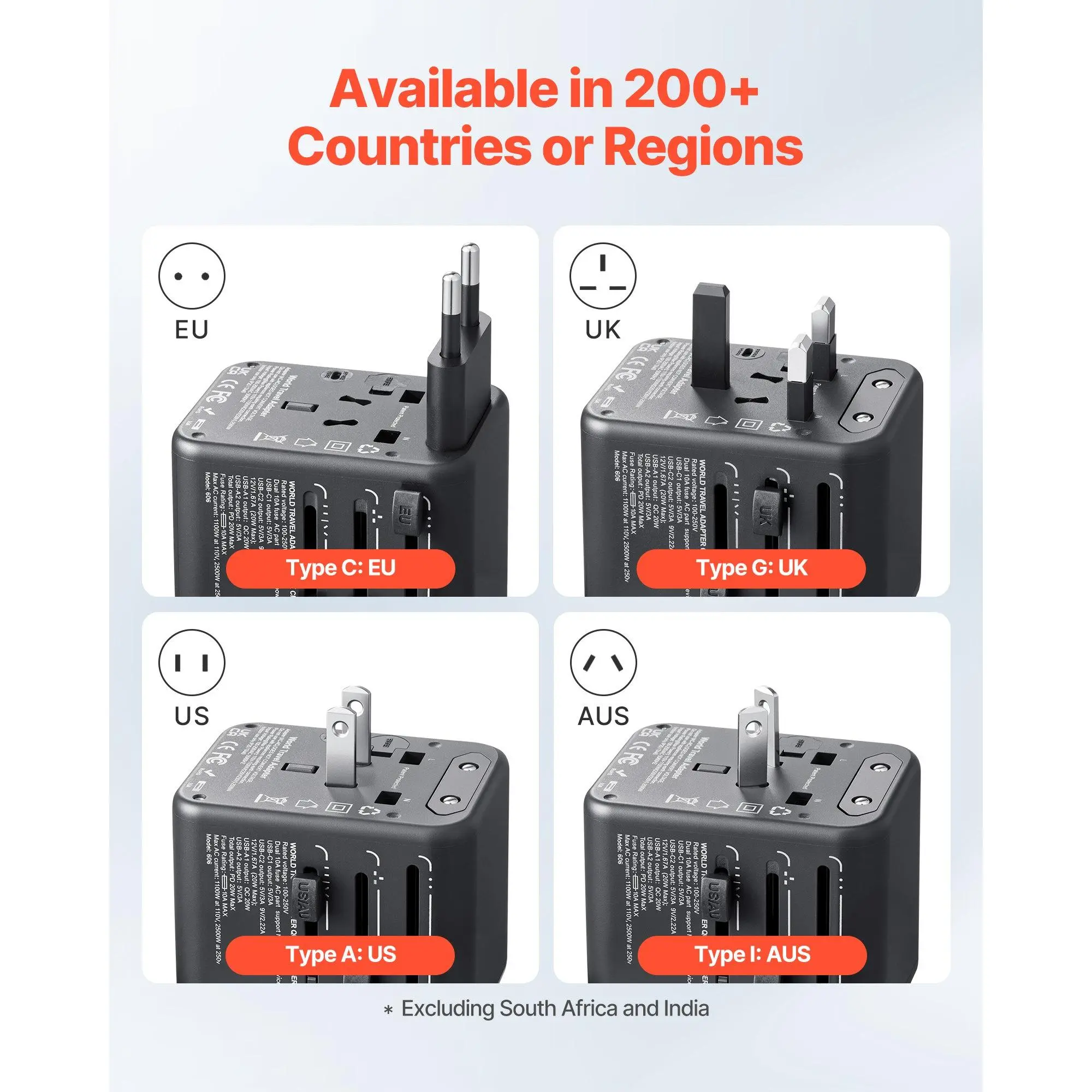 International Plug Adapter: Our universal travel adapter has 4 different push-type plugs (C+G+A+I).It is highly versatile and compatible with 200+ countries and regions (excluding South Africa and India)5 in 1 Multi-Port Design: This 5-in-1 travel adapter has 2 USB-A ports, 2 USB-C ports, and 1 AC outlet.The multi-port design allows for simultaneous charging of 5 devicesFast Charging Support: Our international plug adapter is equipped with 2 USB fast-charging ports, providing efficient charging for your devices.It is ideal for charging devices such as iPhones, laptops, tablets, power banks, headphones, and moreEnhanced Safeguard Design: Our international power adapter has a 10A fuse, spare fuse, security guard, and plug lock system.The shell is made with fire-retardant PC material, it meets strict quality standards for durability and reliabilityCompact and Portable: With dimensions of 2.20 x 2.60 x 2.17 in, our adapter is lightweight and easy to carry, taking up minimal luggage space.It is ideal for travelers, overseas business professionals, workers, and studentsVEVOR Universal Travel Adapter, 5-in-1, International European Power Adapter with 2 USB-C, 2 USB-A Ports, 1 AC Outlet, 4 Different Plugs, Worldwide Plug Adaptor Wall Charger, for Europe UK EU AUS USA