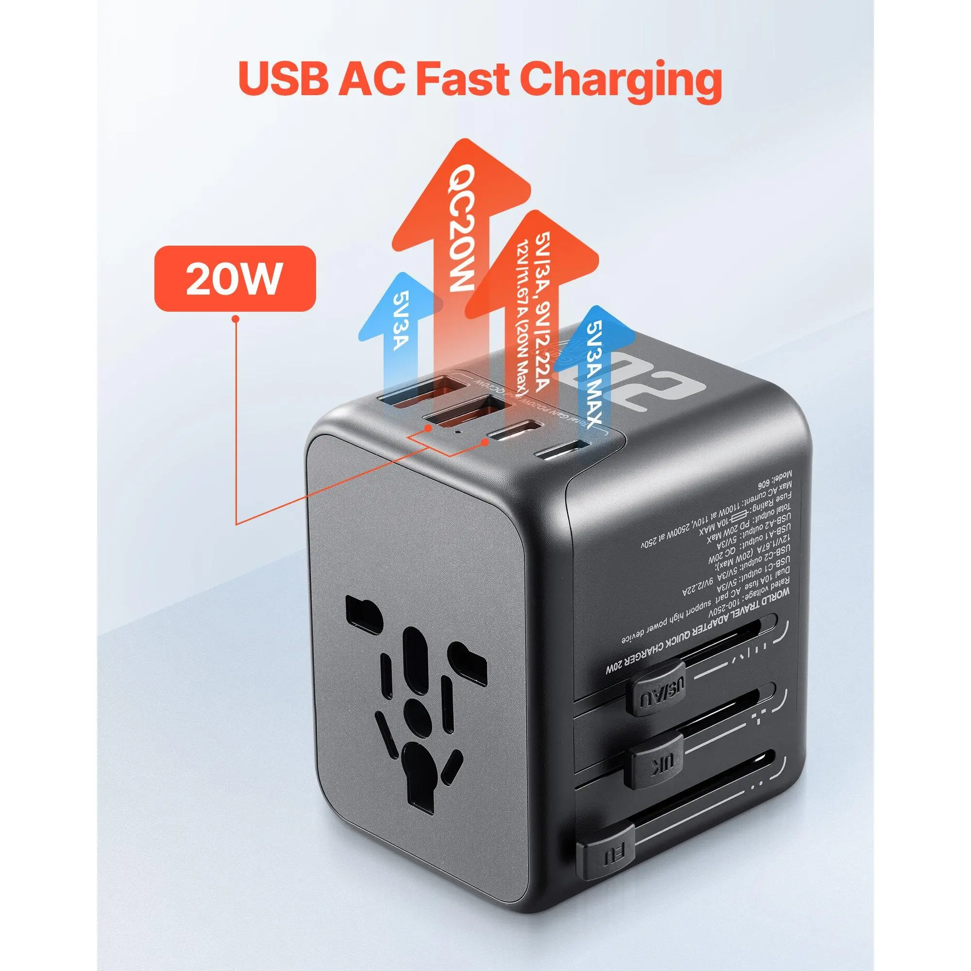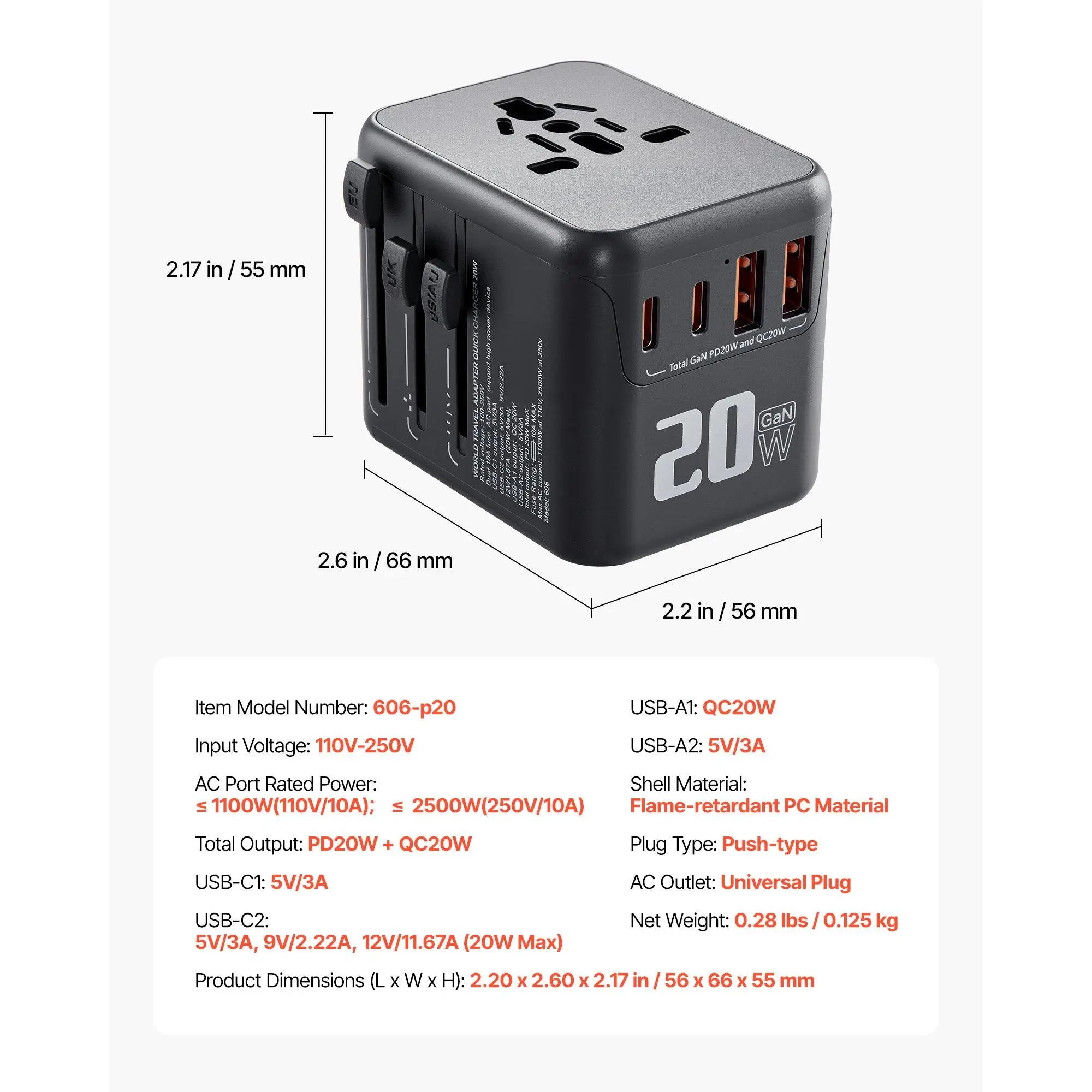 USB-C2: 5V/3A, 9V/2. 22A, 12V11. 67A (20W Max),Plug Type: Push-type(C+G+A+I),USB-A1: QC20W,USB-A2: 5V/3A,Input Voltage: 110V-250V,USB-C1: 5V/3A,AC Port: Universal Plug (Compatible with A/B/C/E/F/G/I/J/L/N) (Not compatible with D/H/K/M/O),Item Model Number: 606-p20,AC Port Rated Power: ≤ 1100W; ≤ 2500W,Total Output: PD20W + QC20W,Shell Material: Flame-retardant PC Material,Product Dimensions (L x W x H): 2. 20 x 2. 60 x 2. 17 in/56 x 66 x 55 mm,Net Weight: 0. 28 lbs/0. 125 kg.