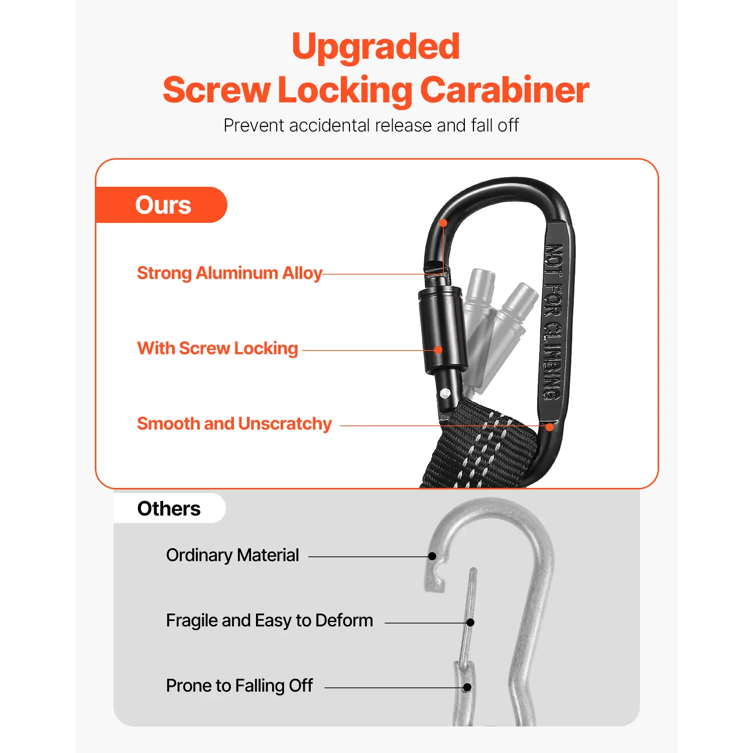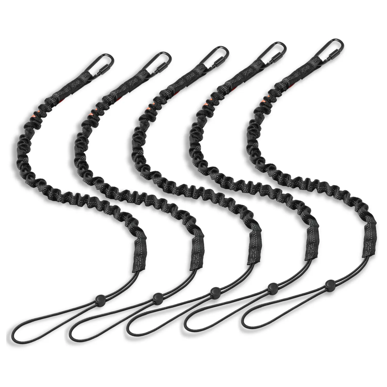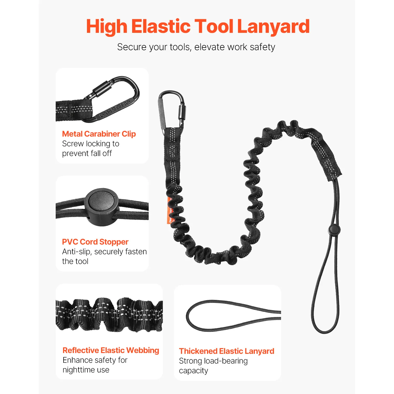 • High-Quality Lanyards: Worried about dropping your tools during high-altitude work? VEVOR's 5 pack high-elastic tool lanyards have you covered! Each lanyard features a upgraded screw-locking aluminum carabiner to prevent accidental drops and a non-slip PVC cord stopper to securely fasten your tools