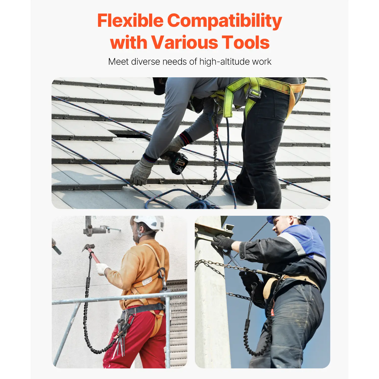 • Multiple Use: Designed to work with hand tools, drills, wrenches, pliers, tape measures, screwdrivers, hammers, and more, our fall protection tool tether prevents tools from falling off roofs, ladders, or trees—ensuring safer, more efficient work at height.