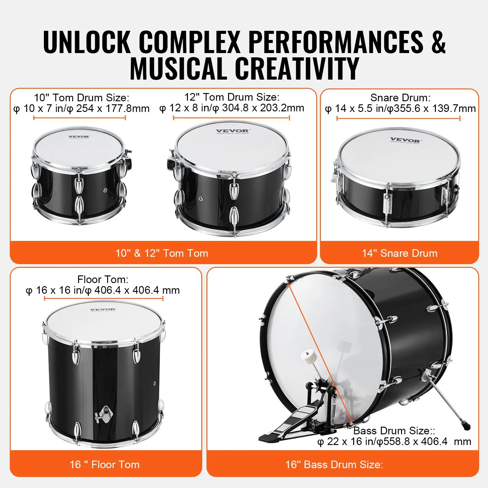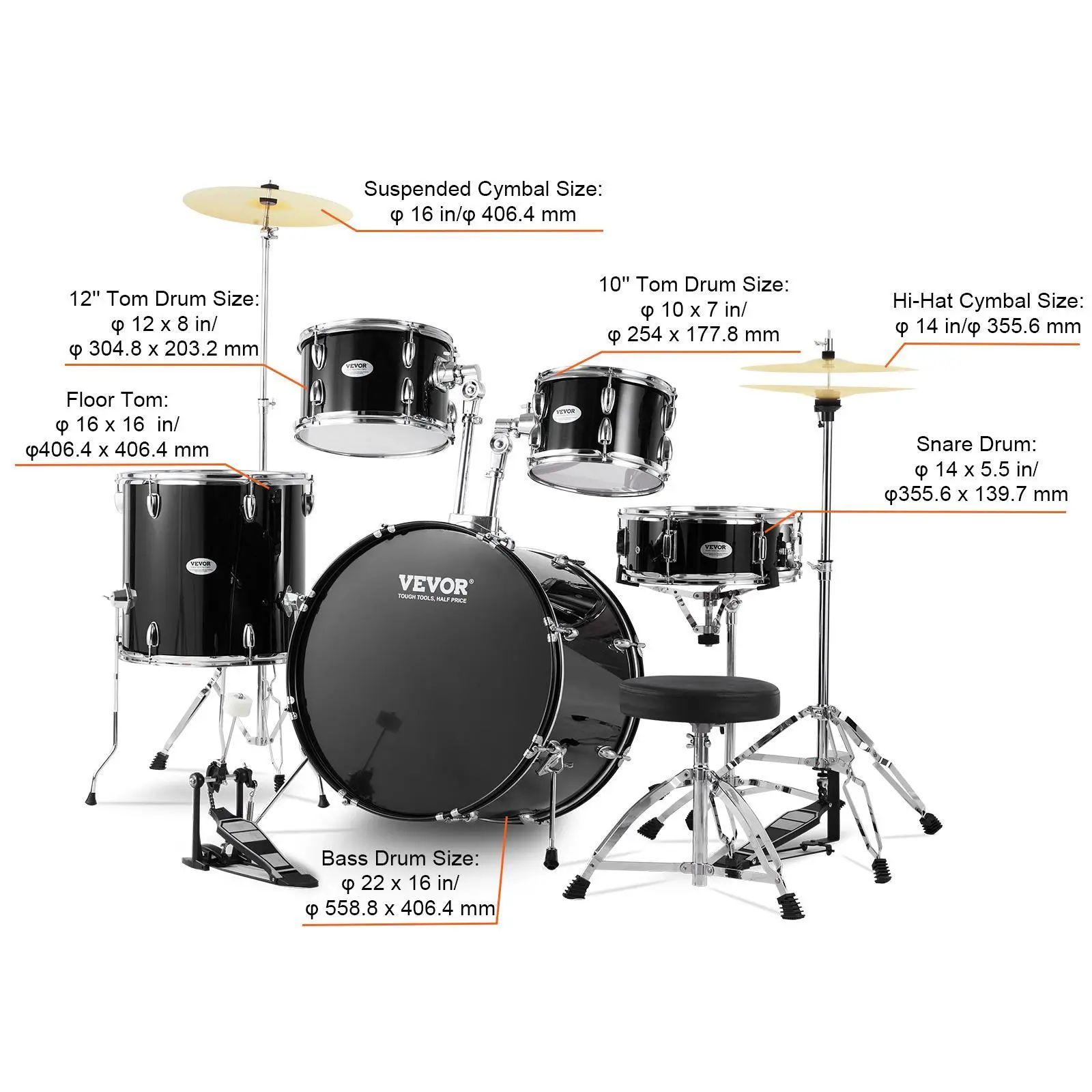 • 5-Piece Beginner-to-Pro Drum Set: Embark on a musical journey from novice to pro with our adult drum kit! It includes a 22'' bass drum with pedal, 14'' snare drum, 10'' & 12'' tom tom, and 16'' floor tom, along with a 10'' suspended cymbal and an 8'' hi-hat cymbal with stand, enabling you to explore complex rhythms and unleash your creativity in music composition.