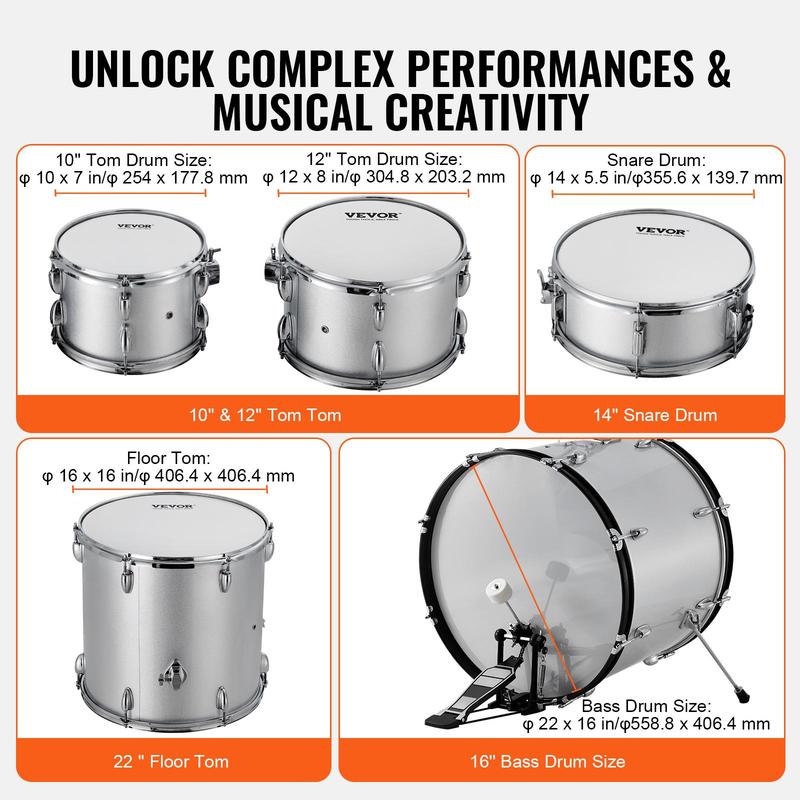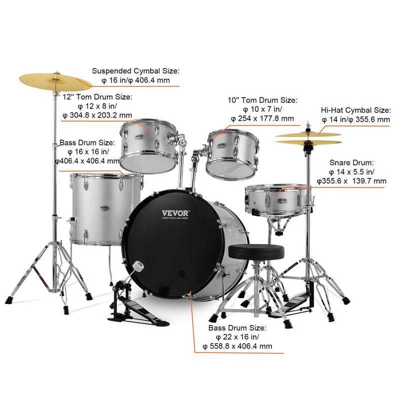 • 5-Piece Beginner-to-Pro Drum Set: Embark on a musical journey from novice to pro with our adult drum kit! It includes a 22'' bass drum with pedal, 14'' snare drum, 10'' & 12'' tom tom, and 16'' floor tom, along with a 10'' suspended cymbal and an 8'' hi-hat cymbal with stand, enabling you to explore complex rhythms and unleash your creativity in music composition.