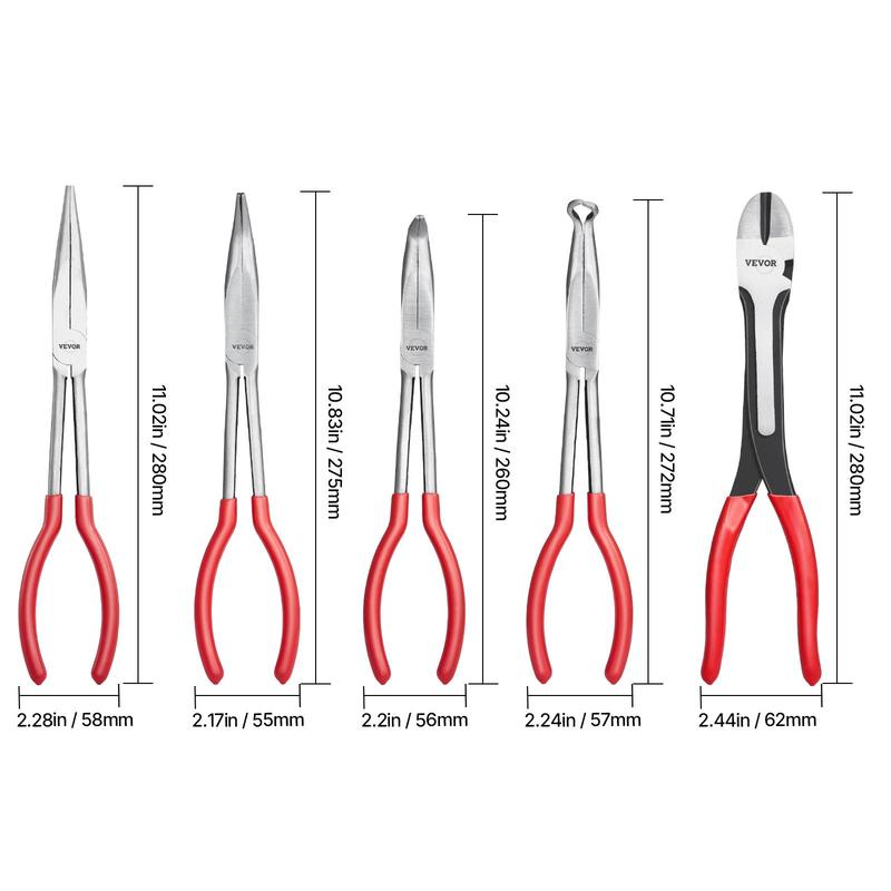 • 5-Piece Long Needle Nose Pliers: This 5-piece long needle nose pliers set includes diagonal cutting pliers, 45° bent nose pliers, 90° bent nose pliers, round nose pliers, and long nose pliers. With various jaw shapes, this set allows you to tackle multiple tasks without constantly switching tools, saving you time and effort.