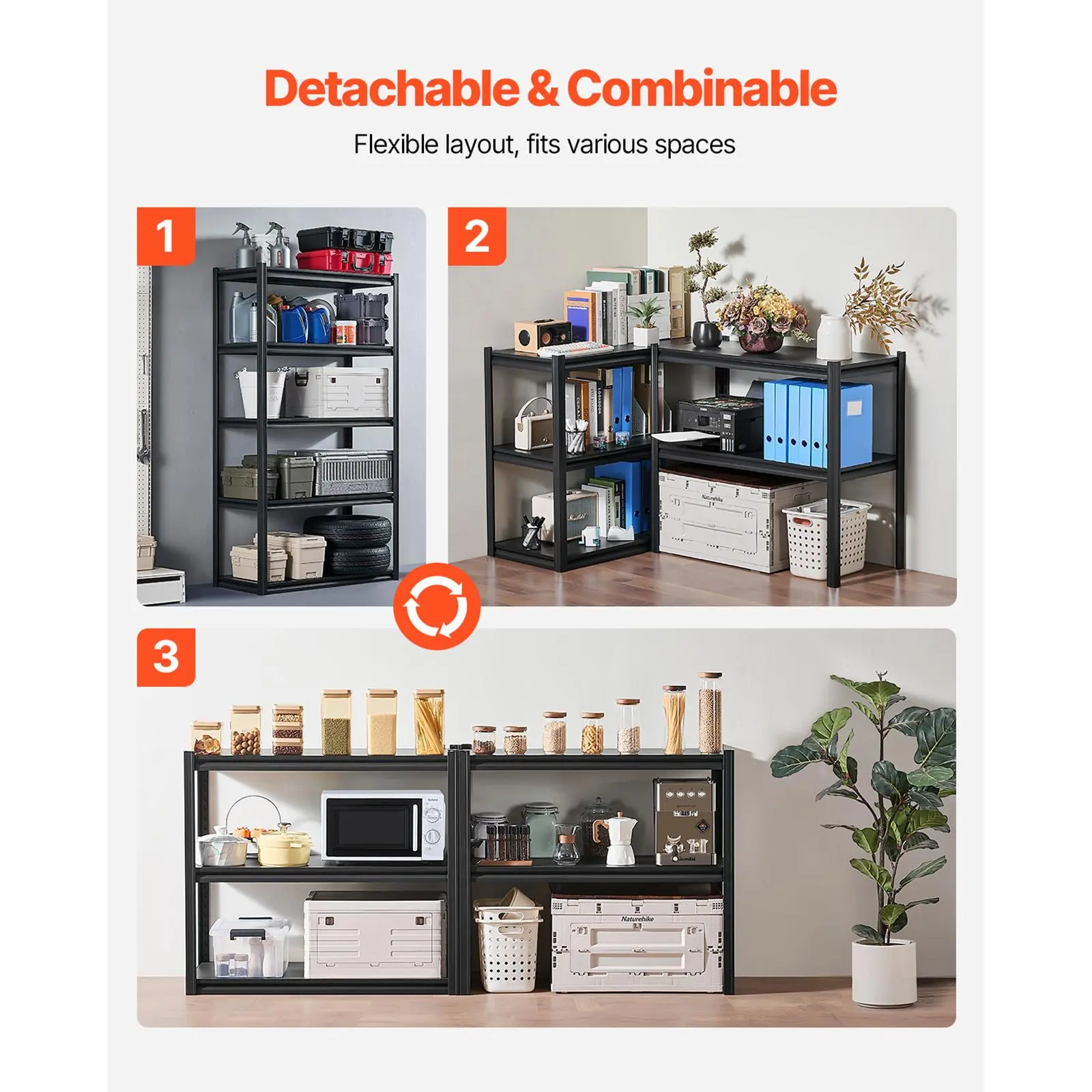 • Split Design: This garage shelving unit can be split into two separate racks for flexible use in spaces with height restrictions, such as under stairs, basements, or hallway corners.