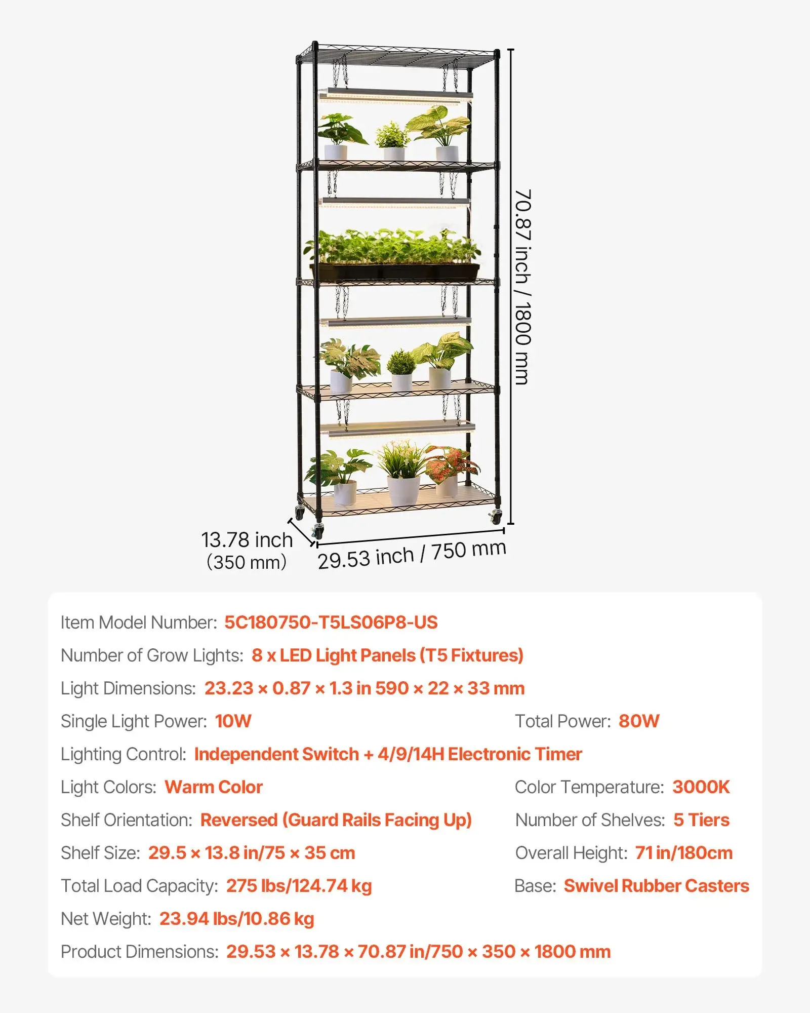 ·5-Tier Plant Stand: Measuring 71 in tall with 5 spacious shelves, the plant stand with grow light is ideal for growing or displaying indoor plants. It offers indoor space for flowers, seedlings, microgreens, and vegetables. No need to move plants outdoors for sunlight.