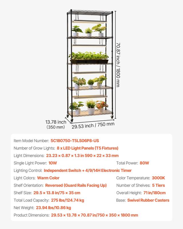 ·Full-Spectrum LED Lights: The indoor plant stand includes 8pcs of 36W T5 LED grow lights (23.23 in each). Each light has an independent switch, giving plants tailored lighting. High light transmission and wide coverage provide optimal light for every growth stage.