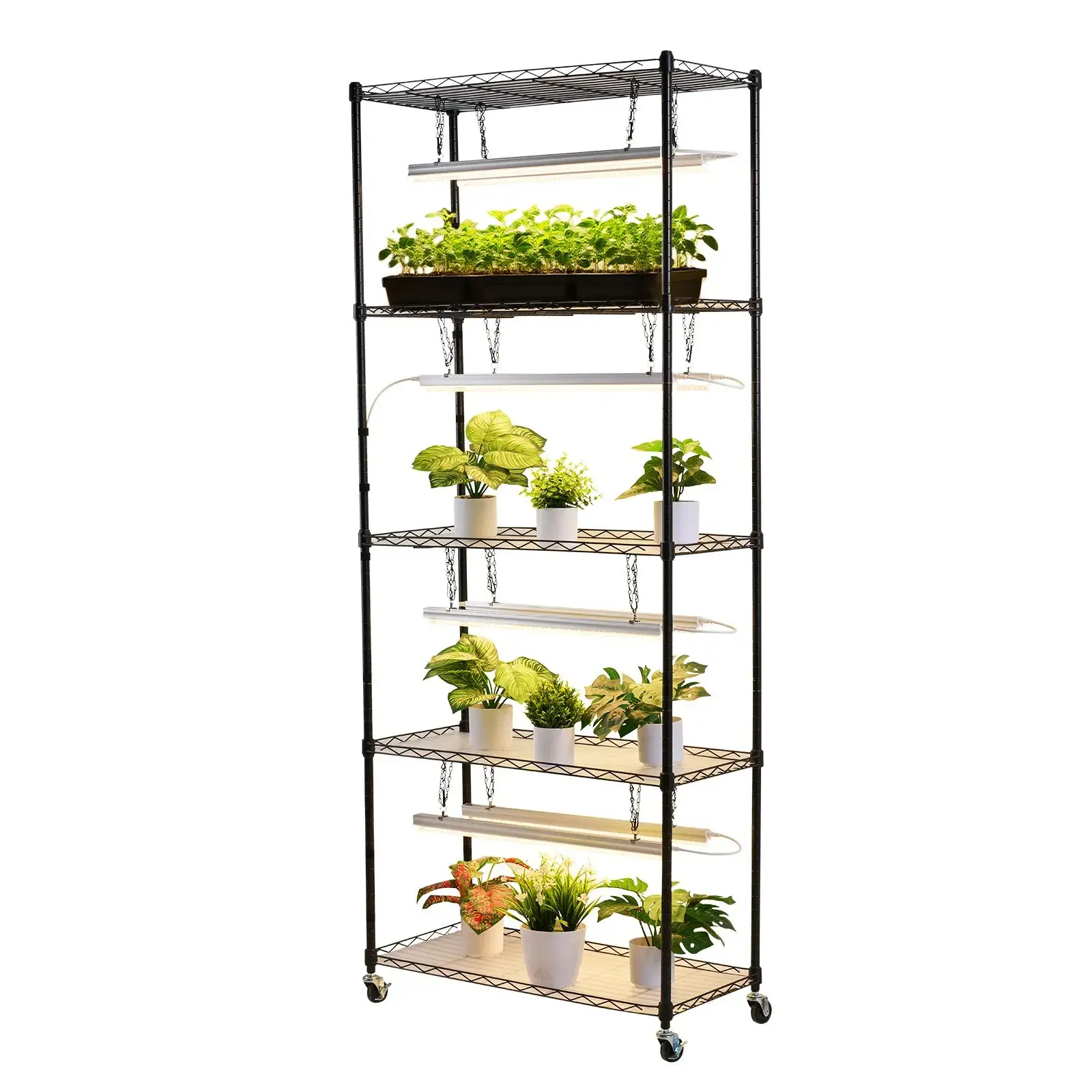 ·Sturdy & Reliable: Built with heavy-duty 0.9 mm iron tubes for strong support, the grow light shelf for plants holds up to 275 lbs. Powder-coated to resist rust. Leak-proof PP trays protect circuits from water. Includes hoop-and-loop straps to secure plants safely.