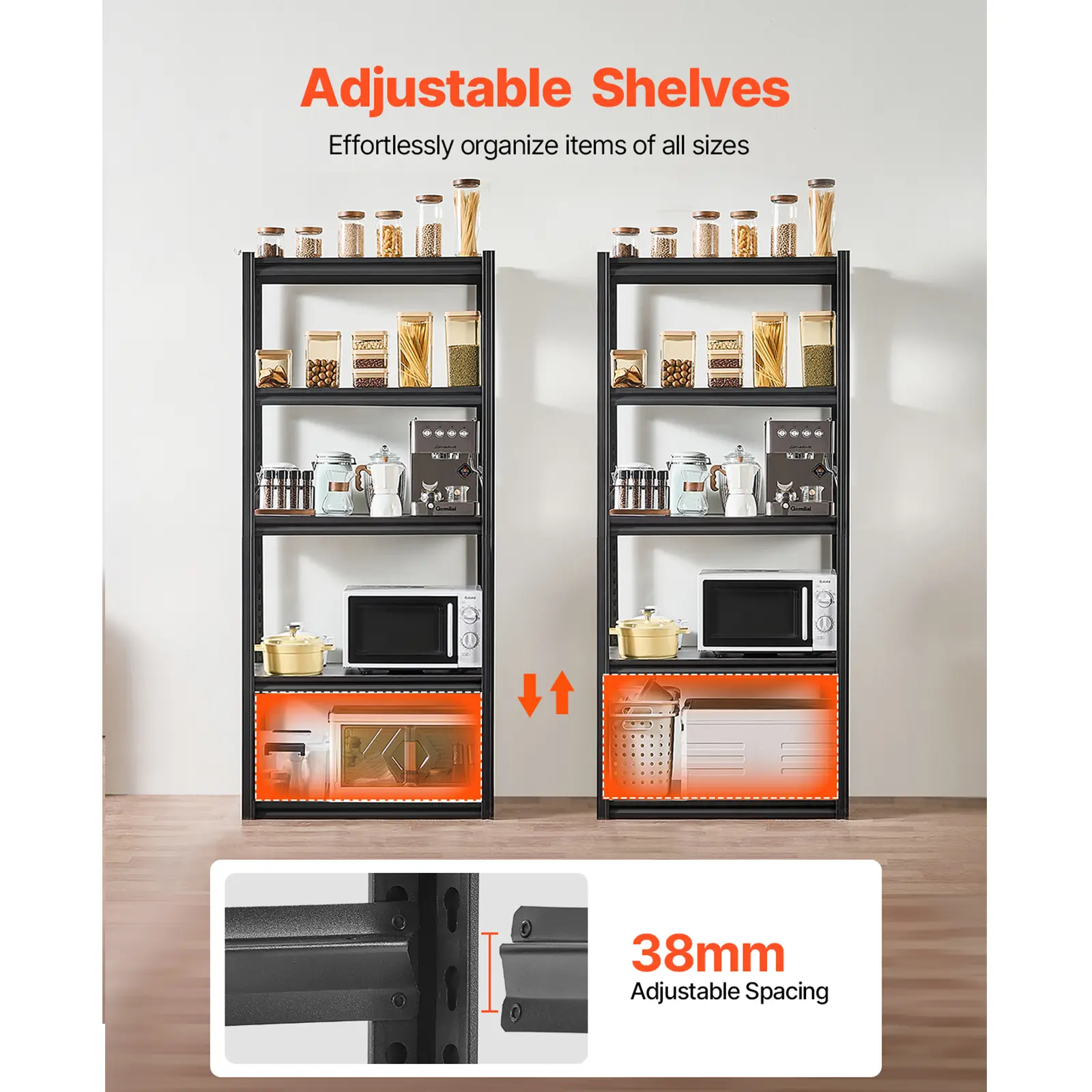 • Flexible Design: The height of our metal shelf is fully adjustable with a convenient quick-adjust mechanism. Using the included locking clips, you can adjust the shelves in 38 mm increments, making it easy to store items of various sizes and maximize space efficiency.