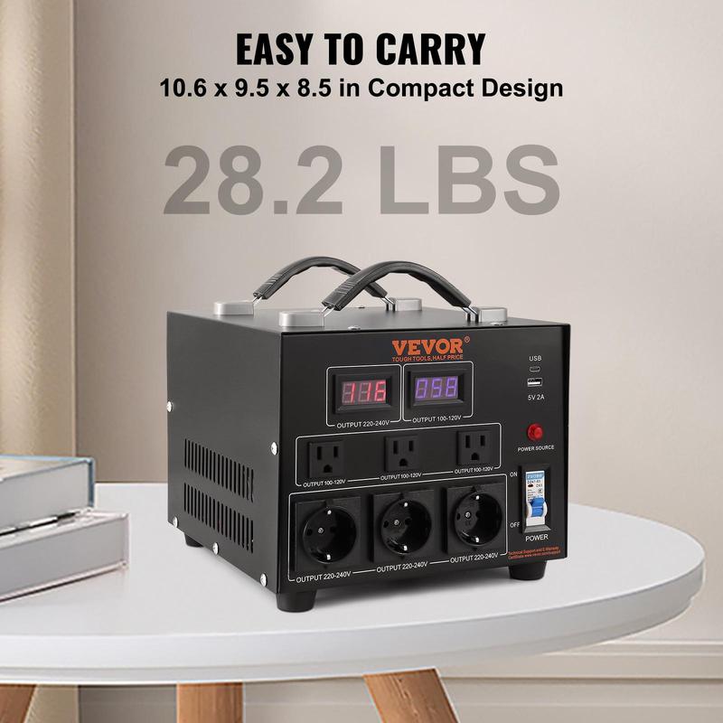 • Portable & Compact Design: The step up step down transformer size is 10.6 x 9.5 x 8.5 in/270 x 240 x 215 mm, not taking up too much space. With an 28.2 lbs/12.8 kg net weight and convenient handle design, it is easy to carry and transport without effort.