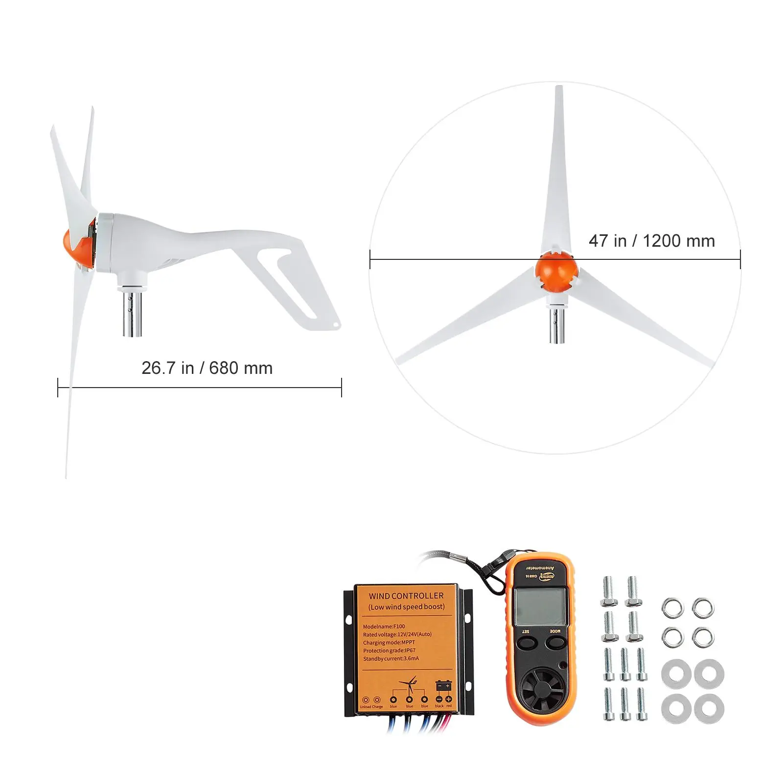 • Premium 3-Blade Design: Crafted from reinforced fiberglass nylon, the waterproof and corrosion-resistant fan blades withstand extreme temperatures from -40°C to 80°C, ensuring consistent and stable performance. With a 47-inch rotor diameter, it efficiently maximizes power generation efficiency.