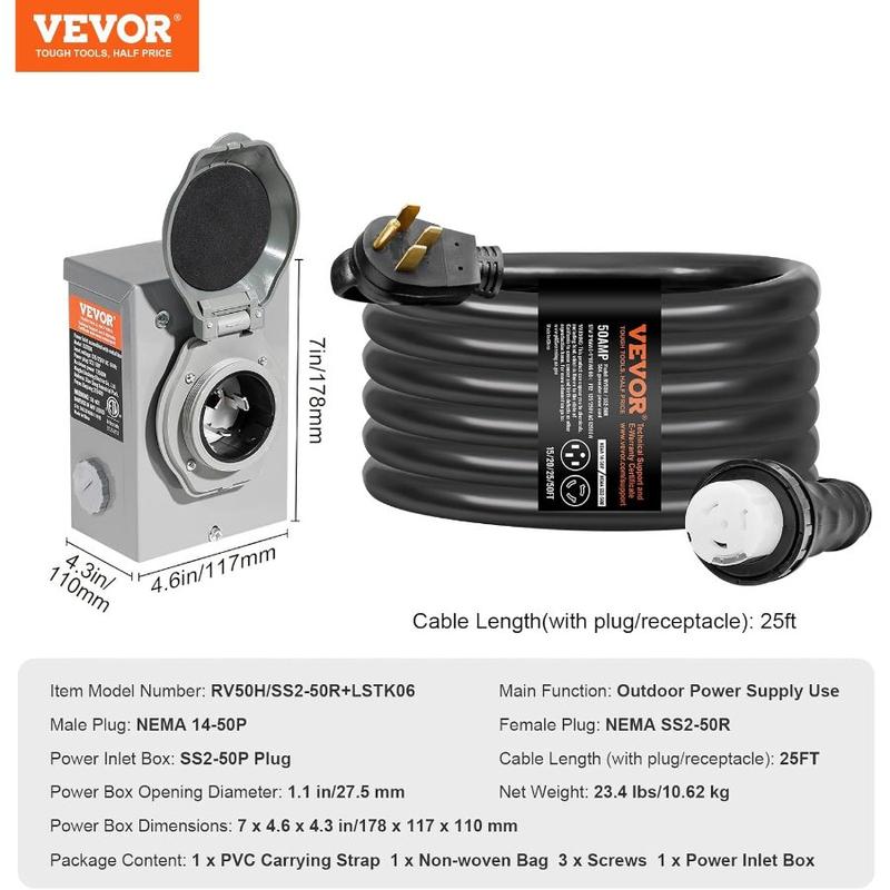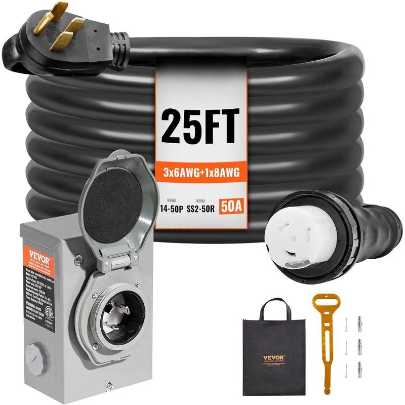 VEVOR 50 Amp Generator Cord and Power Inlet Box Kit, 50FT Generator Extension Cord NEMA 14 - 50P/SS2 - 50R STW 6/3+8/1 AWG with Twist Lock Connector, Pre - Drilled Inlet Box, ETL ListedVEVOR 50 Amp Generator Cord and Power Inlet Box Kit, 50FT Generator Extension Cord NEMA 14 - 50P/SS2 - 50R STW 6/3+8/1 AWG with Twist Lock Connector, Pre - Drilled Inlet Box, ETL Listed