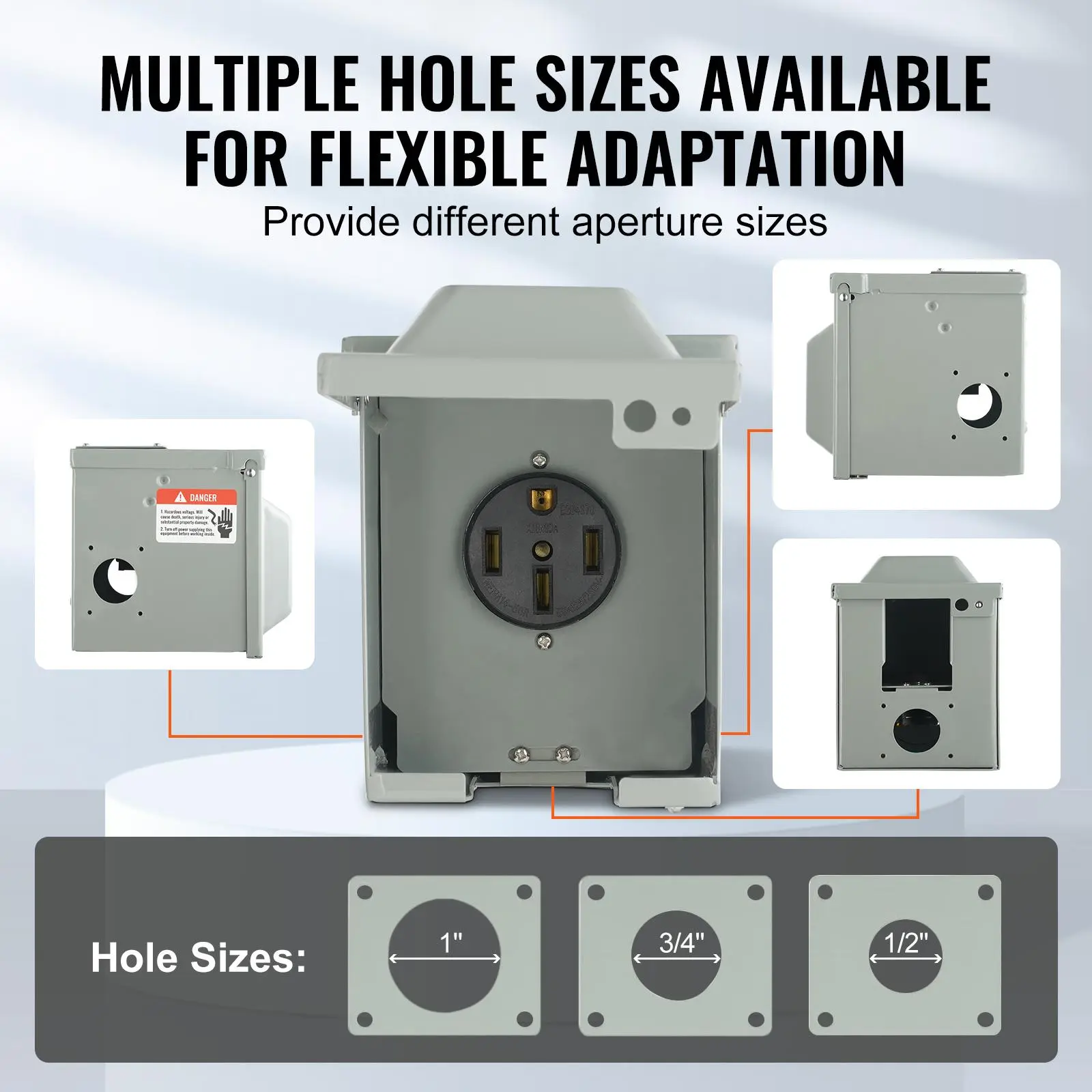 • High Compatibility: Our outdoor rv receptacle comes with pre-knocked holes and three different aperture sizes so that users can choose the appropriate size, ensuring a secure connection and providing more stable and reliable power access.