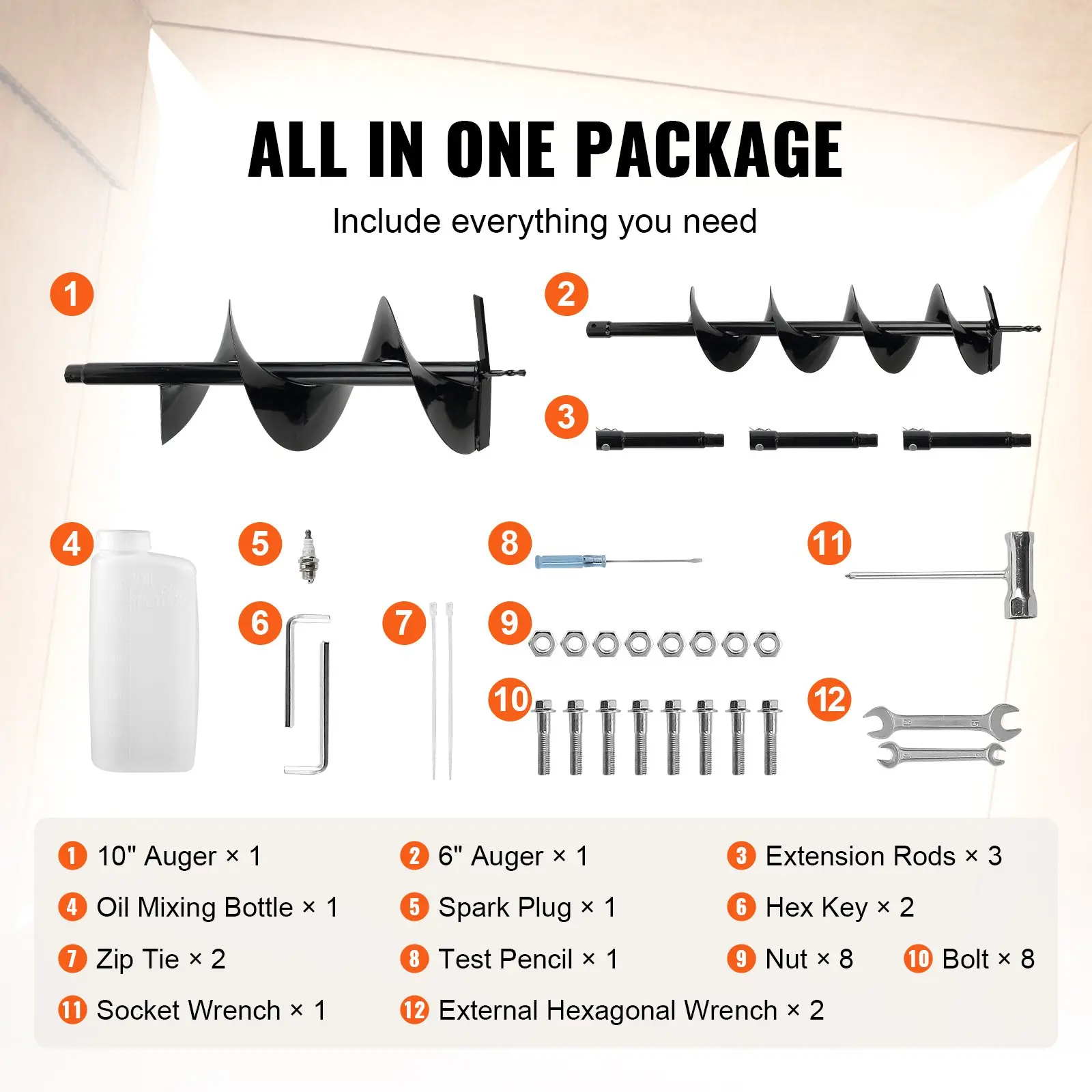 ·Complete Accessories: We ship the main unit and accessories together. It includes 3 extension poles, 2 drill bits, a spark plug, an oil can, and a tool kit. The product is EPA-certified for environmental protection, ensuring its safety and eco-friendliness.