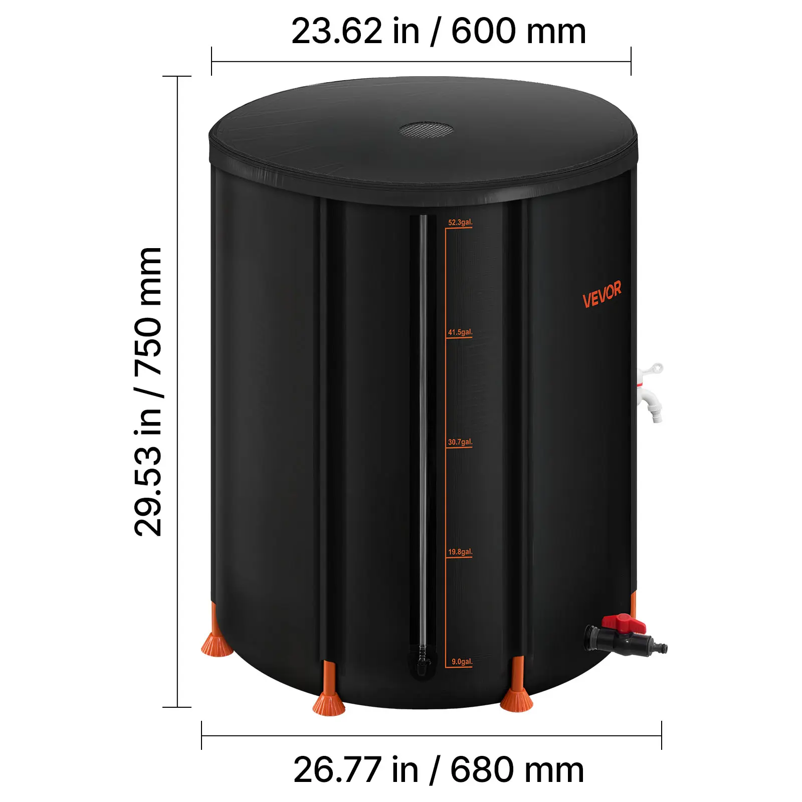 The transparent barrel with scale lines allows easy water level checks. A wide mesh top and two taps offer fast water access, ideal for various uses.