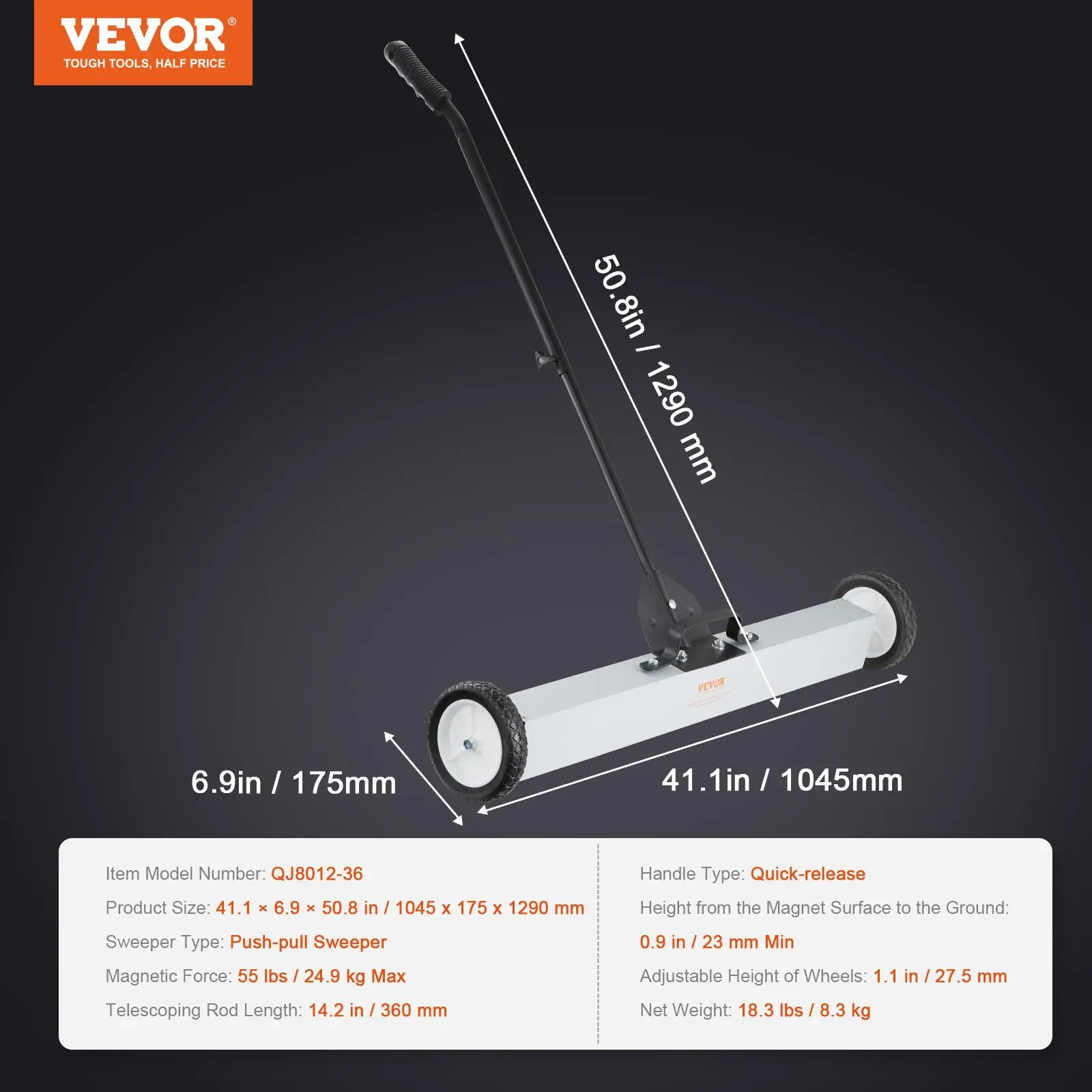 • Precision Cleaning: The extra-wide magnetic rectangle of the 36-inch sweeper magnet ensures thorough coverage and efficient collection of metal debris. Its superior magnetic strength attracts even small metal particles, leaving the worksite clean and free of potential hazards.